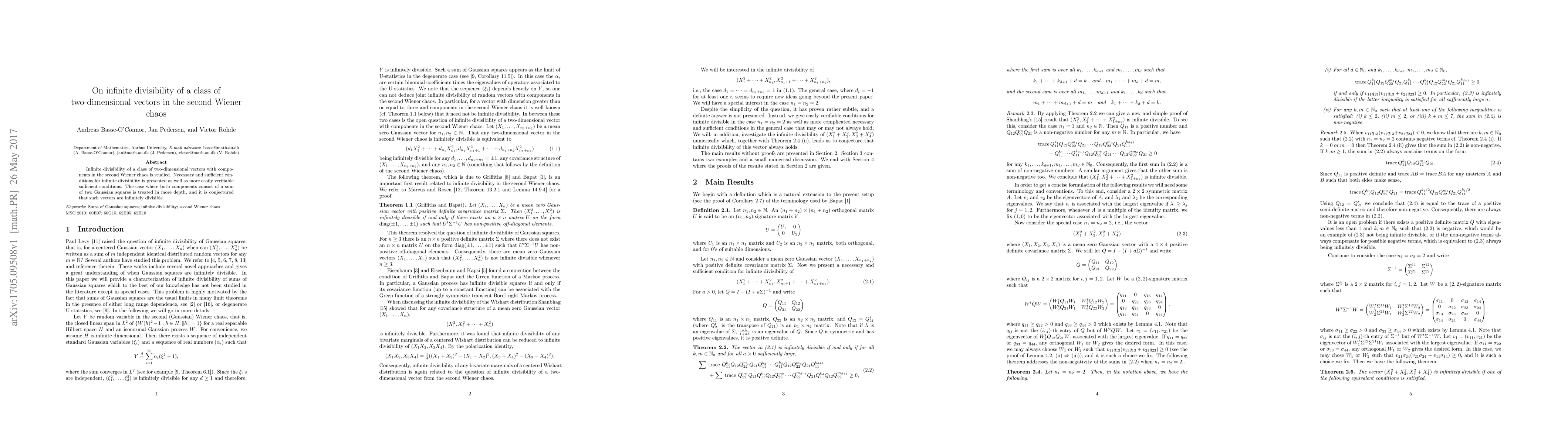 This paper explores the infinite divisibility of two-dimensional vectors whose components lie in the second Wiener chaos, presenting necessary and sufficient conditions for this property. It also delves into the case where both components are sums of two Gaussian squares, proposing a conjecture on their infinite divisibility.