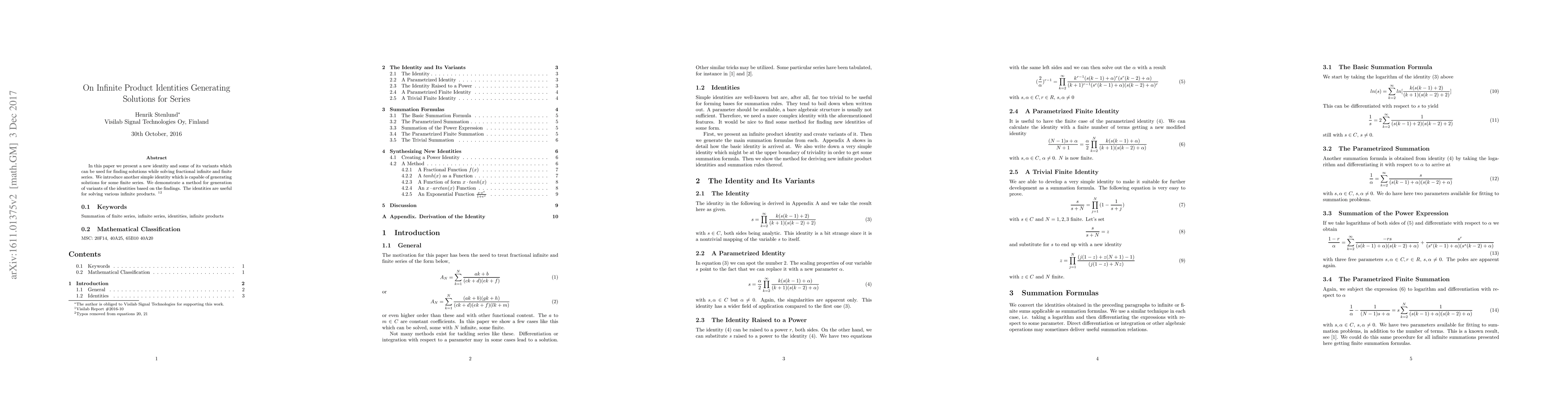 In this paper we present a new identity and some of its variants which can be used for finding solutions while solving fractional infinite and finite series. We introduce another simple identity which is capable of generating solutions for some finite series. We demonstrate a method for generation of variants of the identities based on the findings. The identities are useful for solving various infinite products.