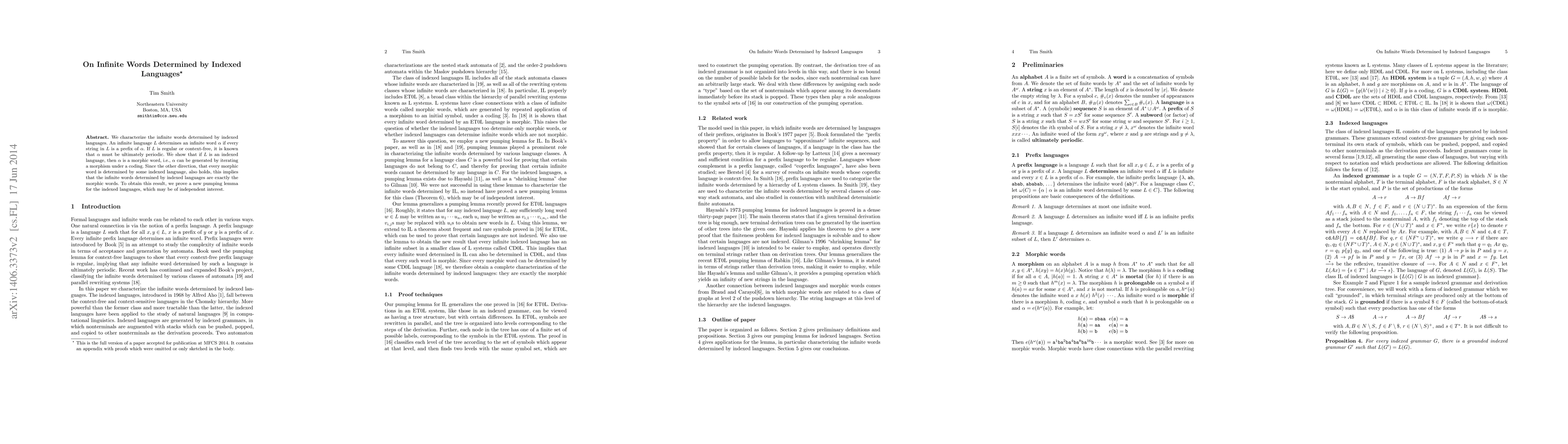 This paper characterizes infinite words determined by indexed languages, proving that such words are morphic, generated by iterating a morphism under a coding. It also establishes a new pumping lemma for indexed languages, which supports the result that every morphic word is determined by some indexed language.