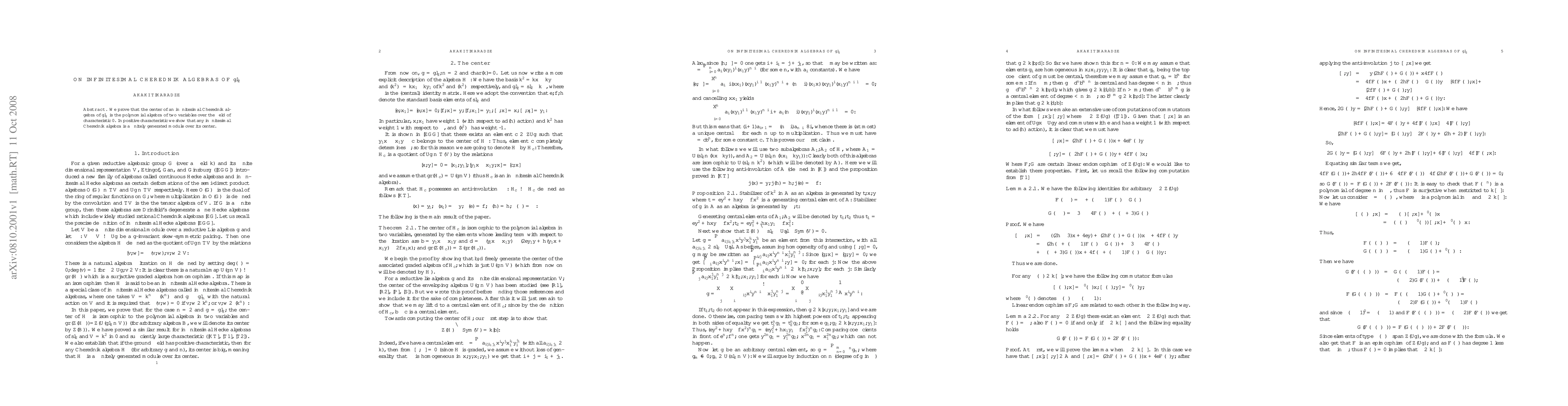 The paper demonstrates that the center of an infinitesimal Cherednik algebra associated with $\mf{gl}_2$ is a polynomial algebra of two variables in characteristic 0. It also establishes that in positive characteristic, such algebras are finitely generated modules over their centers.