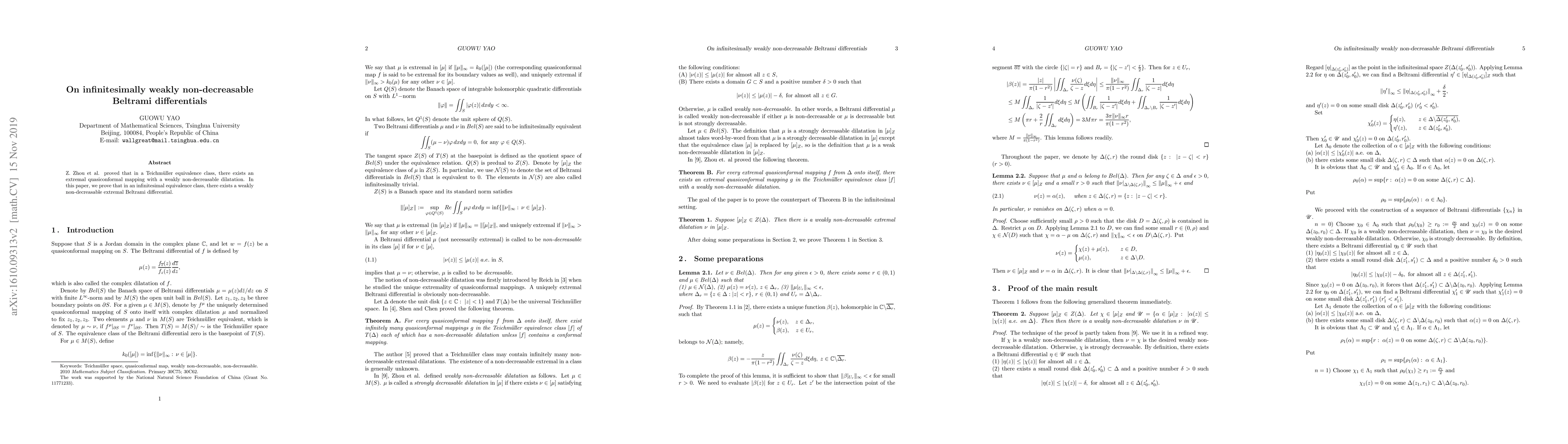 Researchers prove that in an infinitesimal equivalence class of quasiconformal mappings, a weakly non-decreasable extremal Beltrami differential exists.