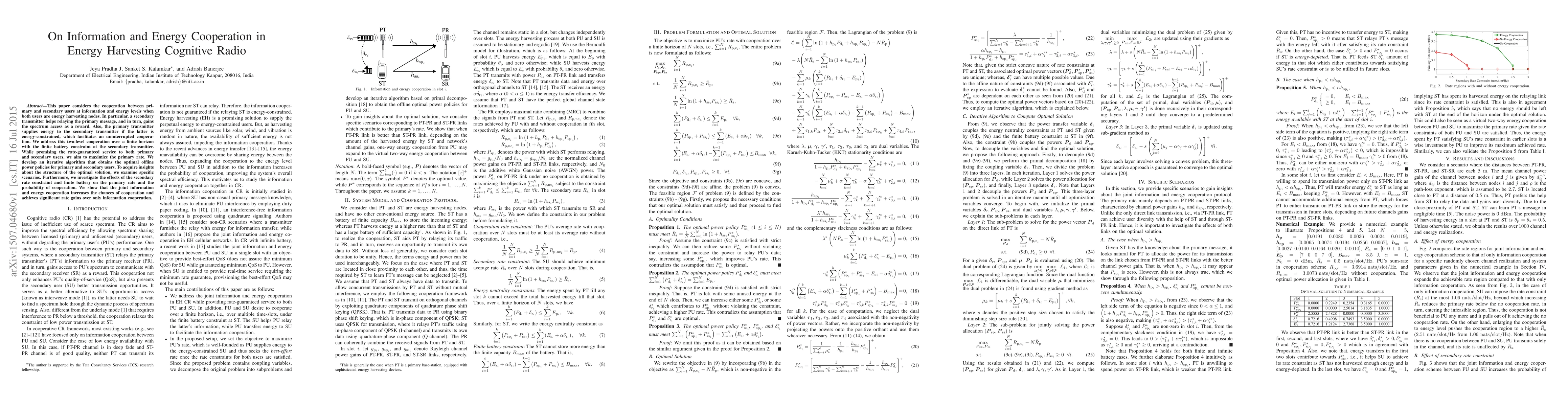 This paper considers the cooperation between primary and secondary users at information and energy levels when both users are energy harvesting nodes. In particular, a secondary transmitter helps relaying the primary message, and in turn, gains the spectrum access as a reward. Also, the primary transmitter supplies energy to the secondary transmitter if the latter is energy-constrained, which facilitates an uninterrupted cooperation. We address this two-level cooperation over a finite horizon with the finite battery constraint at the secondary transmitter. While promising the rate-guaranteed service to both primary and secondary users, we aim to maximize the primary rate. We develop an iterative algorithm that obtains the optimal offline power policies for primary and secondary users. To acquire insights about the structure of the optimal solution, we examine specific scenarios. Furthermore, we investigate the effects of the secondary rate constraint and finite battery on the primary rate and the probability of cooperation. We show that the joint information and energy cooperation increases the chances of cooperation and achieves significant rate gains over only information cooperation.