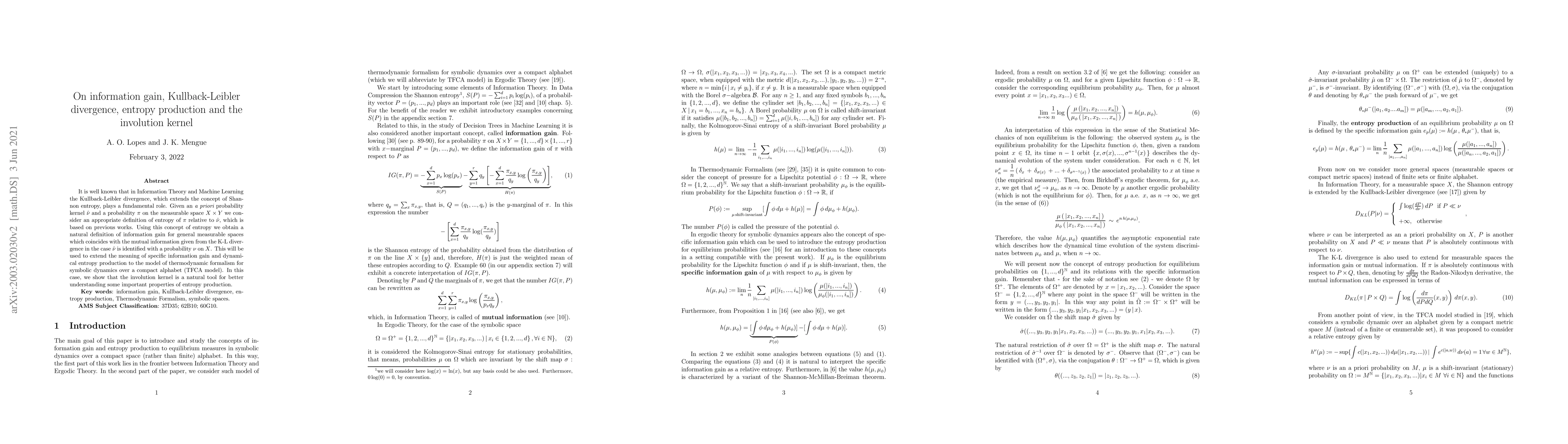 This paper explores the relationship between Kullback-Leibler divergence, entropy, and information gain in the context of Information Theory and Machine Learning. It introduces a new definition of entropy relative to a given probability kernel and uses it to extend concepts of information gain and dynamical entropy to the thermodynamic formalism for symbolic dynamics.