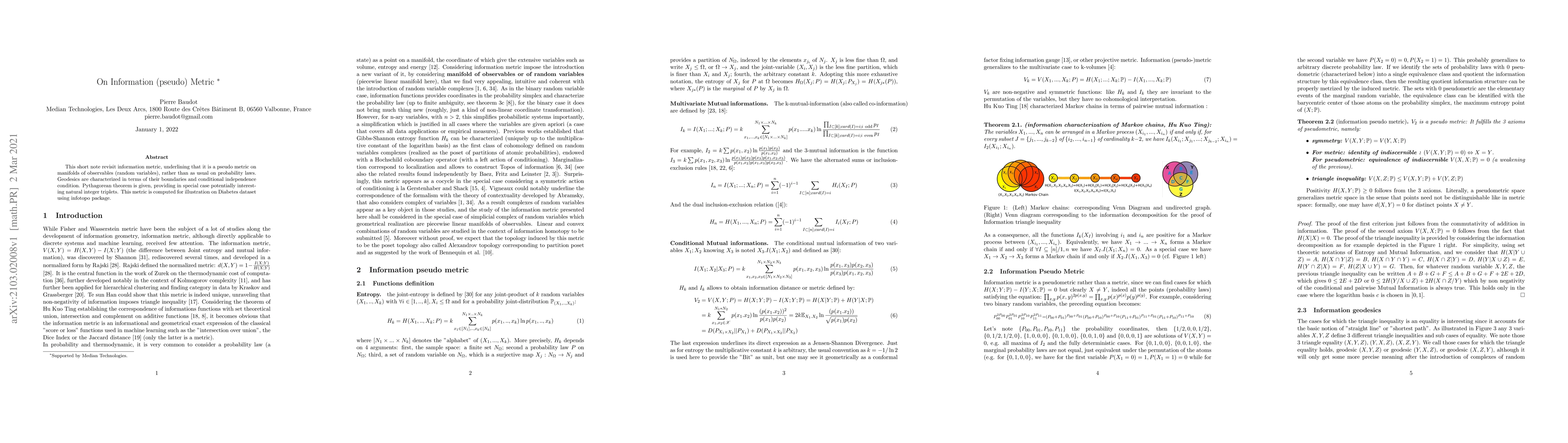 This short note revisit information metric, underlining that it is a pseudo metric on manifolds of observables (random variables), rather than as usual on probability laws. Geodesics are characterized in terms of their boundaries and conditional independence condition. Pythagorean theorem is given, providing in special case potentially interesting natural integer triplets. This metric is computed for illustration on Diabetes dataset using infotopo package.