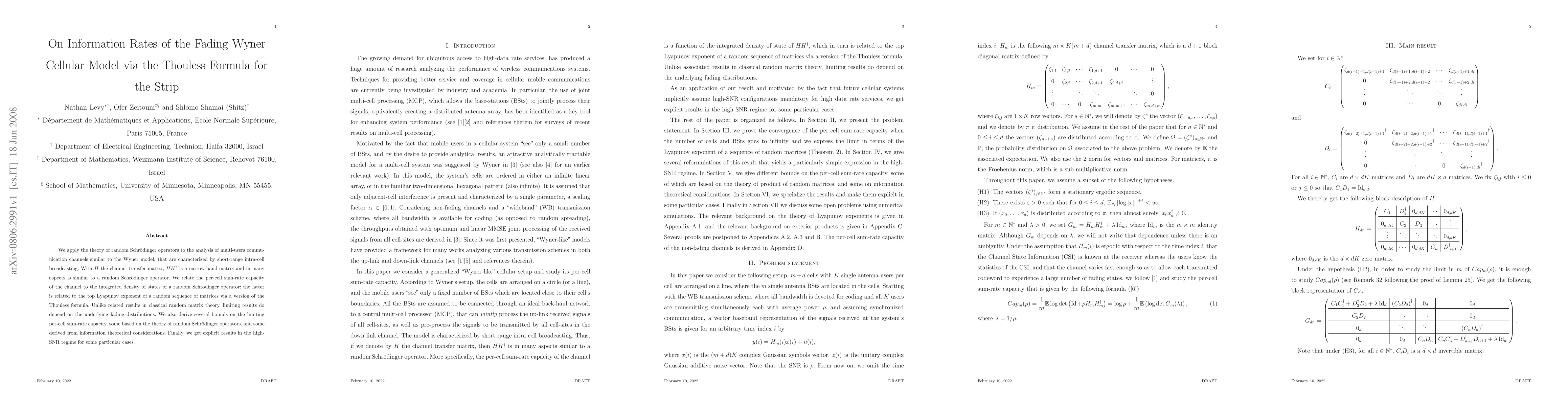 We apply the theory of random Schr\"odinger operators to the analysis of multi-users communication channels similar to the Wyner model, that are characterized by short-range intra-cell broadcasting. With $H$ the channel transfer matrix, $HH^\dagger$ is a narrow-band matrix and in many aspects is similar to a random Schr\"odinger operator. We relate the per-cell sum-rate capacity of the channel to the integrated density of states of a random Schr\"odinger operator; the latter is related to the top Lyapunov exponent of a random sequence of matrices via a version of the Thouless formula. Unlike related results in classical random matrix theory, limiting results do depend on the underlying fading distributions. We also derive several bounds on the limiting per-cell sum-rate capacity, some based on the theory of random Schr\"odinger operators, and some derived from information theoretical considerations. Finally, we get explicit results in the high-SNR regime for some particular cases.
