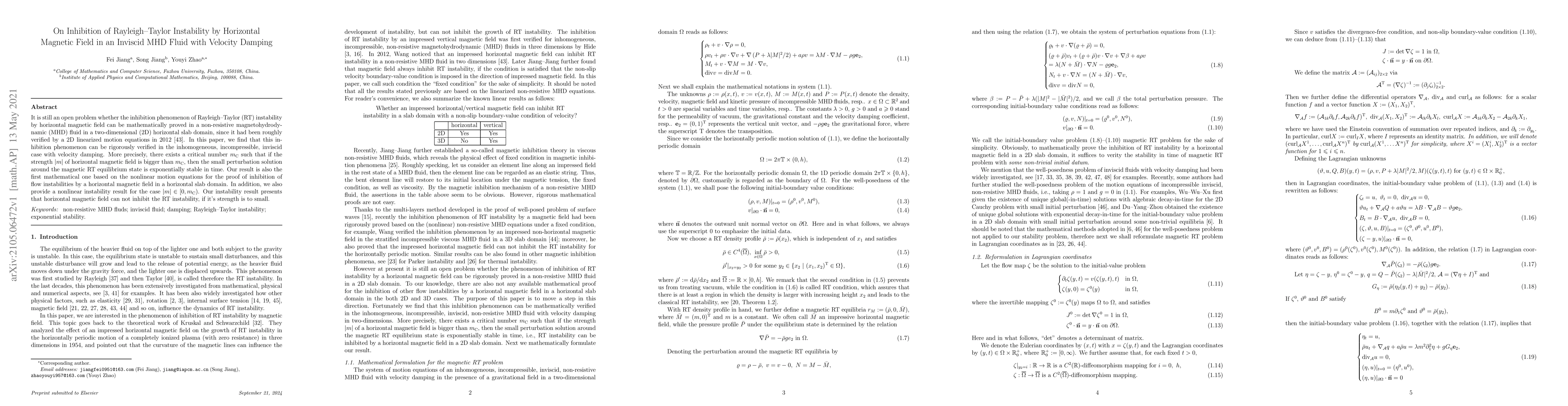This paper rigorously proves the inhibition of Rayleigh-Taylor instability by a horizontal magnetic field in an inviscid magnetohydrodynamic fluid with velocity damping, establishing a critical magnetic field strength for stability. It also provides a nonlinear instability result for insufficient magnetic field strength.