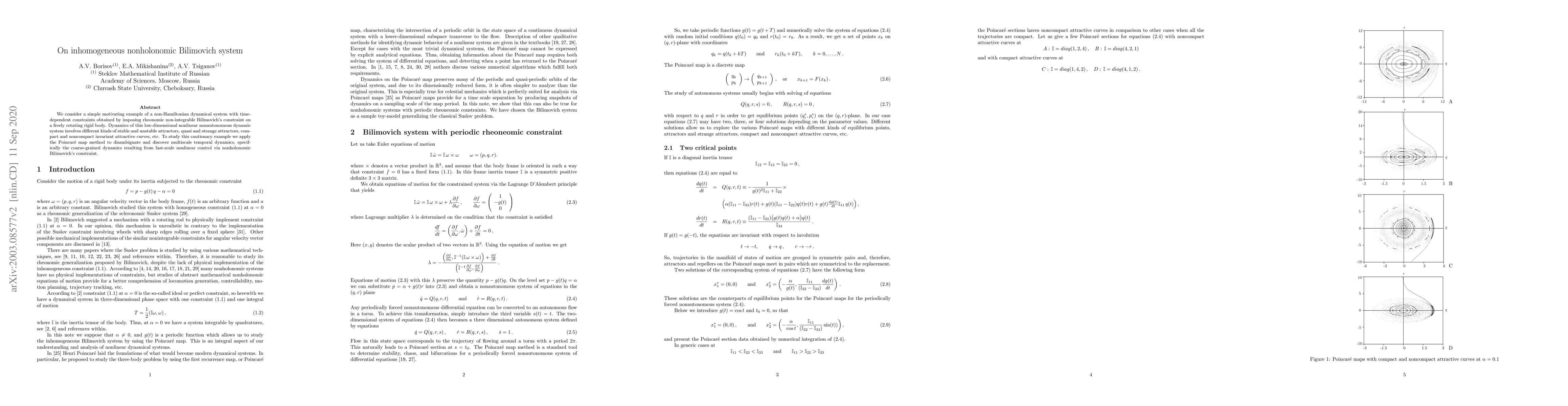 We consider a simple motivating example of a non-Hamiltonian dynamical system with time-dependent constraints obtained by imposing rheonomic non-integrable Bilimovich's constraint on a freely rotating rigid body. Dynamics of this low-dimensional nonlinear nonautonomous dynamic system involves different kinds of stable and unstable attractors, quasi and strange attractors, compact and noncompact invariant attractive curves, etc. To study this cautionary example we apply the Poincar\'{e} map method to disambiguate and discover multiscale temporal dynamics, specifically the coarse-grained dynamics resulting from fast-scale nonlinear control via nonholonomic Bilimovich's constraint.