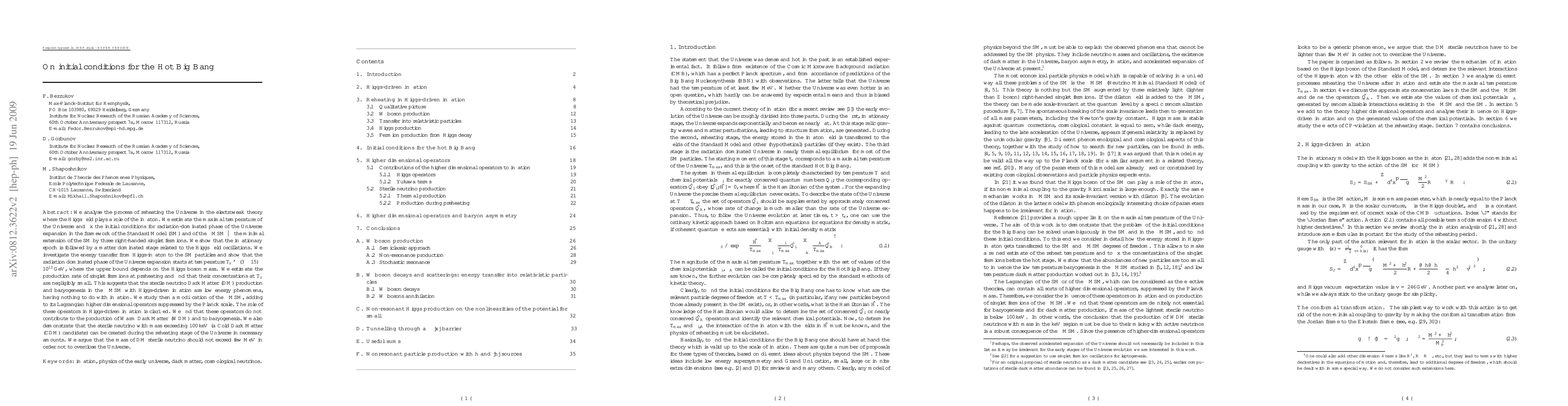 We analyse the process of reheating the Universe in the electroweak theory where the Higgs field plays a role of the inflaton. We estimate the maximal temperature of the Universe and fix the initial conditions for radiation-dominated phase of the Universe expansion in the framework of the Standard Model (SM) and of the nuMSM -- the minimal extension of the SM by three right-handed singlet fermions. We show that the inflationary epoch is followed by a matter dominated stage related to the Higgs field oscillations. We investigate the energy transfer from Higgs-inflaton to the SM particles and show that the radiation dominated phase of the Universe expansion starts at temperature T_r~(3-15)*10^{13} GeV, where the upper bound depends on the Higgs boson mass. We estimate the production rate of singlet fermions at preheating and find that their concentrations at T_r are negligibly small. This suggests that the sterile neutrino Dark Matter (DM) production and baryogenesis in the nuMSM with Higgs-driven inflation are low energy phenomena, having nothing to do with inflation. We study then a modification of the nuMSM, adding to its Lagrangian higher dimensional operators suppressed by the Planck scale. The role of these operators in Higgs-driven inflation is clarified. We find that these operators do not contribute to the production of Warm Dark Matter (WDM) and to baryogenesis. We also demonstrate that the sterile neutrino with mass exceeding 100 keV (a Cold Dark Matter (CDM) candidate) can be created during the reheating stage of the Universe in necessary amounts. We argue that the mass of DM sterile neutrino should not exceed few MeV in order not to overclose the Universe.