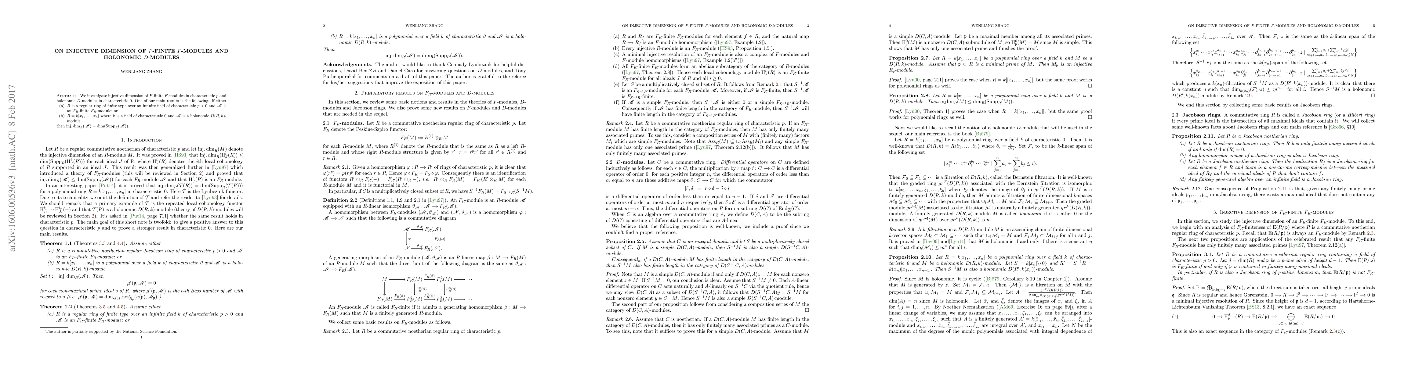 This paper examines the injective dimension of $F$-finite $F$-modules in positive characteristic and holonomic $D$-modules in characteristic 0. The key result shows that for specific modules over regular rings or polynomial rings, the injective dimension equals the dimension of the module's support.