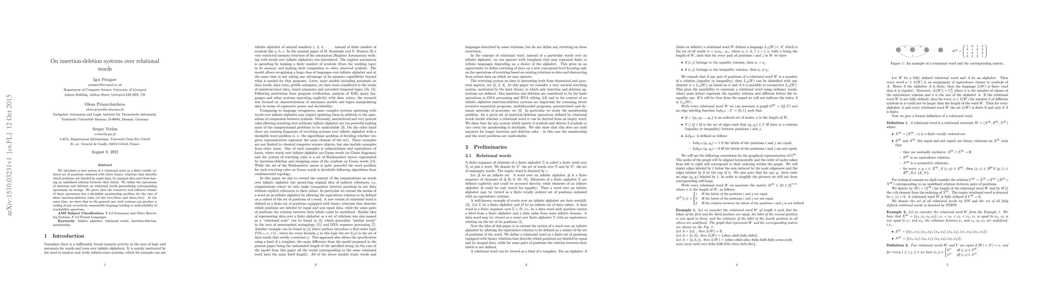 We introduce a new notion of a relational word as a finite totally ordered set of positions endowed with three binary relations that describe which positions are labeled by equal data, by unequal data and those having an undefined relation between their labels. We define the operations of insertion and deletion on relational words generalizing corresponding operations on strings. We prove that the transitive and reflexive closure of these operations has a decidable membership problem for the case of short insertion-deletion rules (of size two/three and three/two). At the same time, we show that in the general case such systems can produce a coding of any recursively enumerable language leading to undecidabilty of reachability questions.