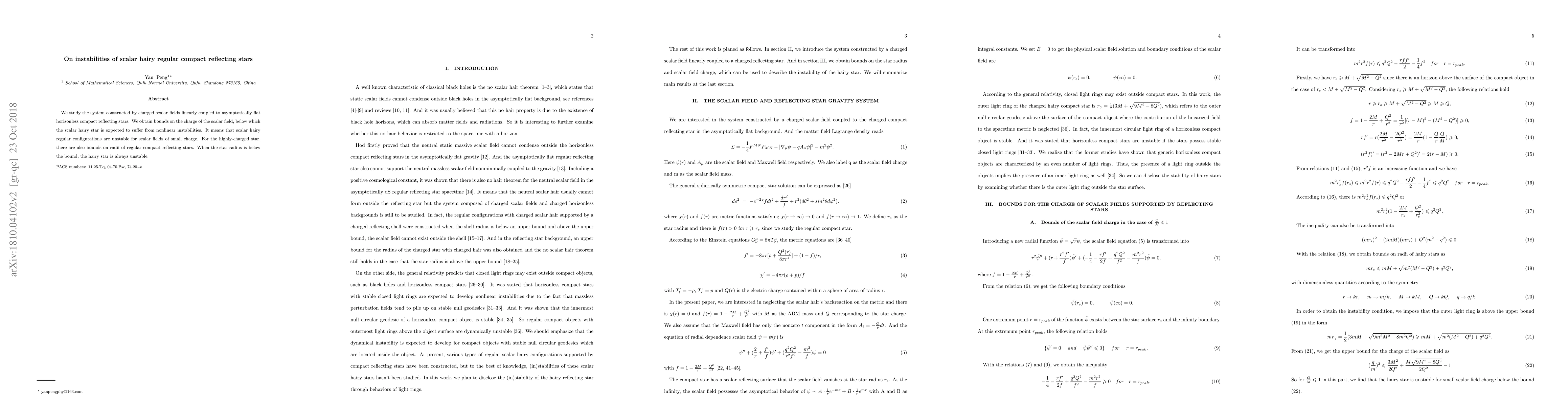 We study the system constructed by charged scalar fields linearly coupled to asymptotically flat horizonless compact reflecting stars. We obtain bounds on the charge of the scalar field, below which the scalar hairy star is expected to suffer from nonlinear instabilities. It means that scalar hairy regular configurations are unstable for scalar fields of small charge. For the highly-charged star, there are also bounds on radii of regular compact reflecting stars. When the star radius is below the bound, the hairy star is always unstable.