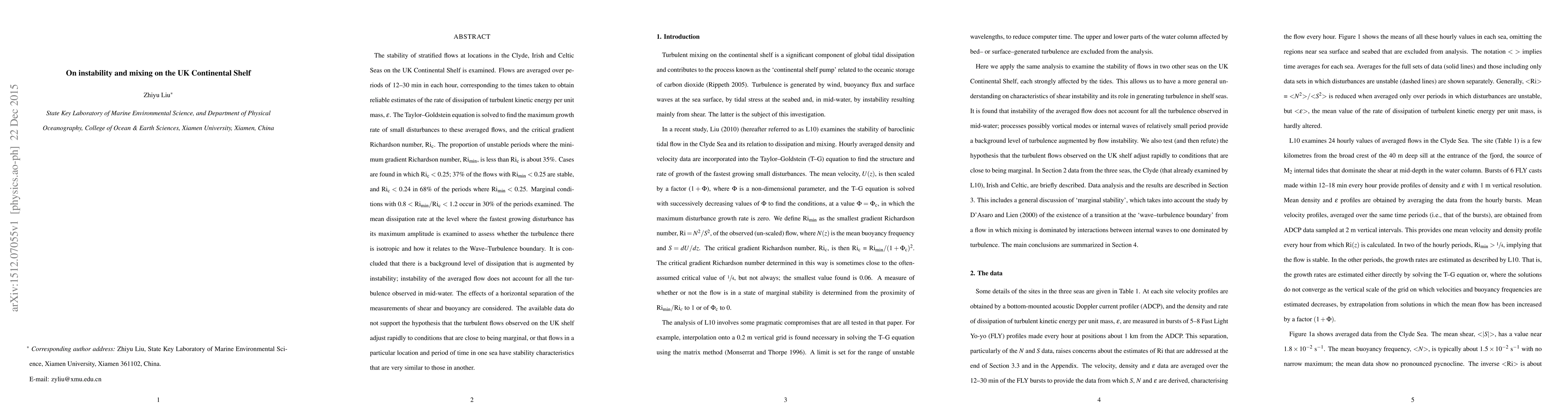 The study examines the stability of stratified flows on the UK Continental Shelf by averaging flow data over 12-30 minute intervals, solving the Taylor-Goldstein equation to find maximum growth rates and critical gradient Richardson numbers, and analyzing dissipation rates to assess turbulence isotropy.