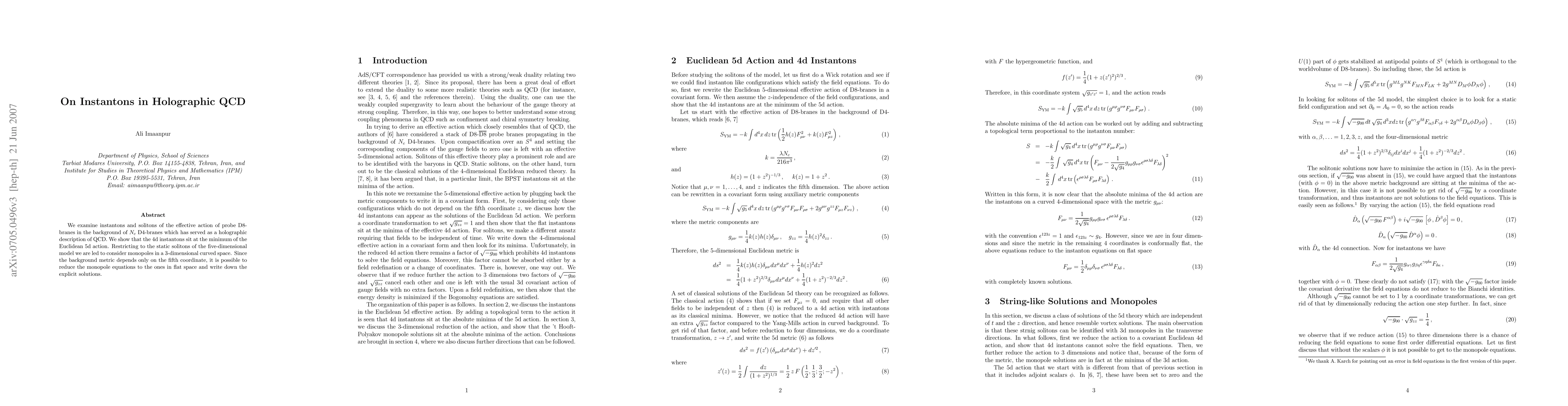 This paper investigates instantons and solitons in the holographic QCD model using probe D8-branes in the background of D4-branes, revealing that 4d instantons are at the minimum of the Euclidean 5d action. It further simplifies the monopole equations to flat space solutions due to the background metric's dependence on the fifth coordinate.