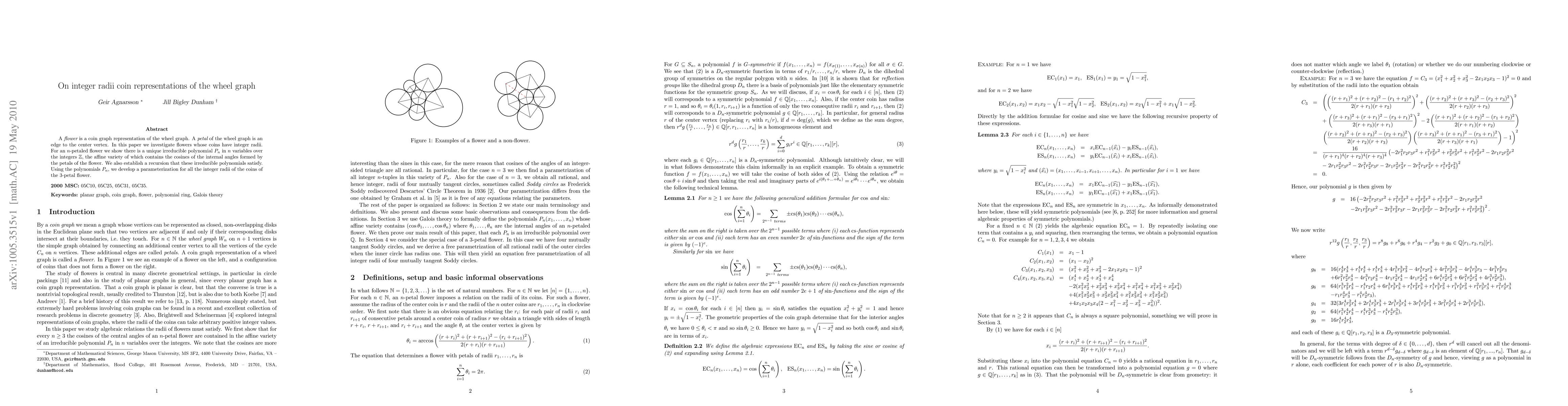 A {\em flower} is a coin graph representation of the wheel graph. A {\em petal} of the wheel graph is an edge to the center vertex. In this paper we investigate flowers whose coins have integer radii. For an $n$-petaled flower we show there is a unique irreducible polynomial $P_n$ in $n$ variables over the integers $\ints$, the affine variety of which contains the cosines of the internal angles formed by the petals of the flower. We also establish a recursion that these irreducible polynomials satisfy. Using the polynomials $P_n$, we develop a parameterization for all the integer radii of the coins of the 3-petal flower.