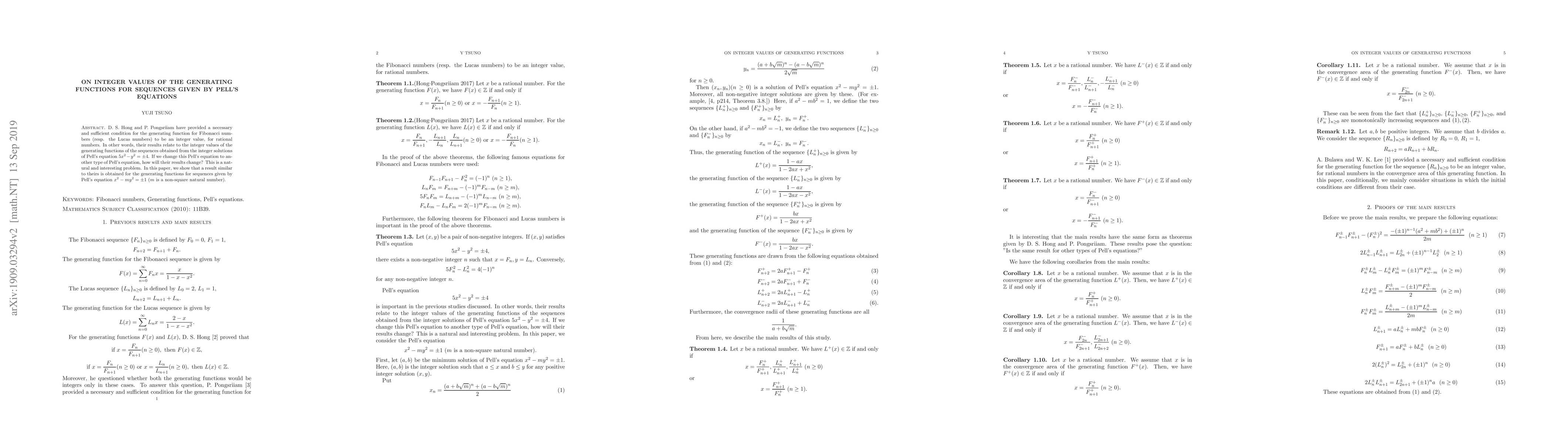 D. S. Hong and P. Pongsriiam have provided a necessary and sufficient condition for the generating function for Fibonacci numbers (resp. the Lucas numbers) to be an integer value, for rational numbers. In other words, their results relate to the integer values of the generating functions of the sequences obtained from the integer solutions of Pell's equation $5x^{2}-y^{2}=\pm4$. If we change this Pell's equation to another type of Pell's equation, how will their results change? This is a natural and interesting problem. In this paper, we show that a result similar to theirs is obtained for the generating functions for sequences given by Pell's equation $x^{2}-my^{2}=\pm1 \ (m\text{ is a non-square natural number})$.