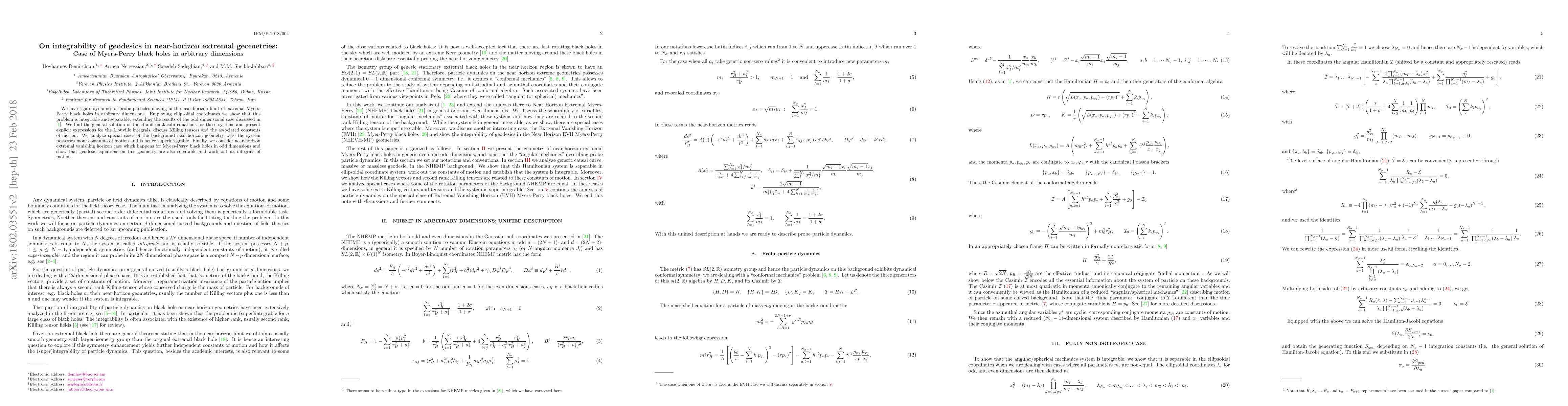 We investigate dynamics of probe particles moving in the near-horizon limit of extremal Myers-Perry black holes in arbitrary dimensions. Employing ellipsoidal coordinates we show that this problem is integrable and separable, extending the results of the odd dimensional case discussed in arXiv:1703.00713. We find the general solution of the Hamilton-Jacobi equations for these systems and present explicit expressions for the Liouville integrals, discuss Killing tensors and the associated constants of motion. We analyze special cases of the background near-horizon geometry were the system possesses more constants of motion and is hence superintegrable. Finally, we consider near-horizon extremal vanishing horizon case which happens for Myers-Perry black holes in odd dimensions and show that geodesic equations on this geometry are also separable and work out its integrals of motion.