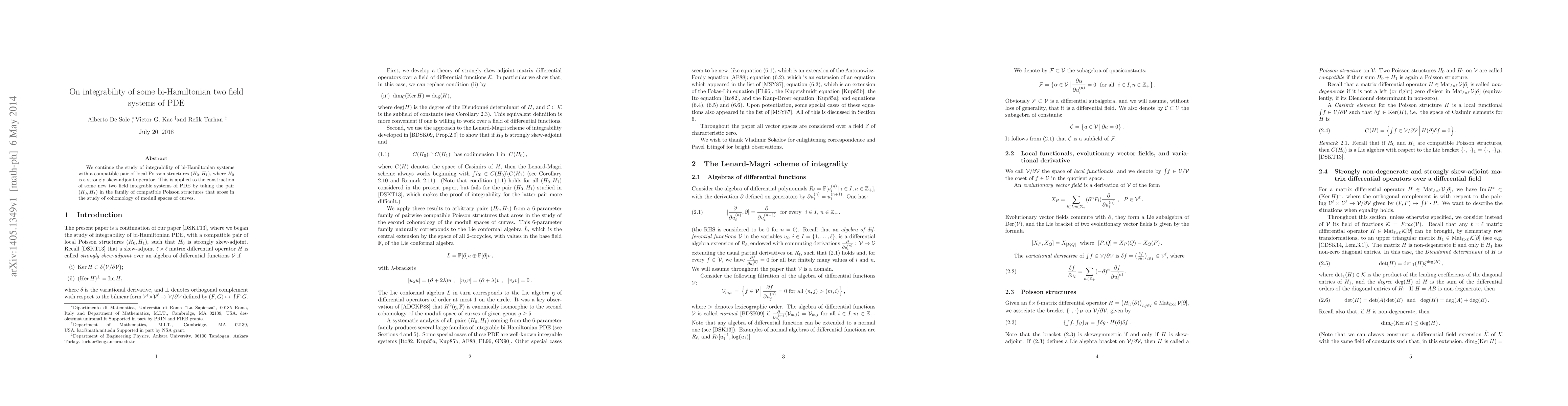 We continue the study of integrability of bi-Hamiltonian systems with a compatible pair of local Poisson structures (H_0,H_1), where H_0 is a strongly skew-adjoint operator. This is applied to the construction of some new two field integrable systems of PDE by taking the pair (H_0,H_1) in the family of compatible Poisson structures that arose in the study of cohomology of moduli spaces of curves.