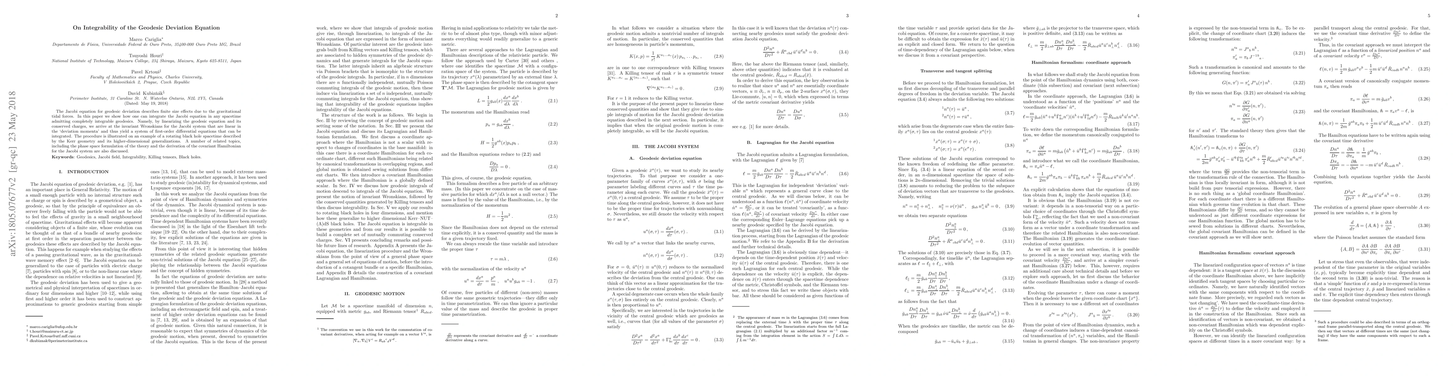This paper demonstrates a method for integrating the Jacobi equation for geodesic deviation in any spacetime with integrable geodesics, leading to first-order differential equations. The approach is exemplified using the Kerr geometry and its higher-dimensional generalizations, alongside discussions on phase space formulation and the covariant Hamiltonian.