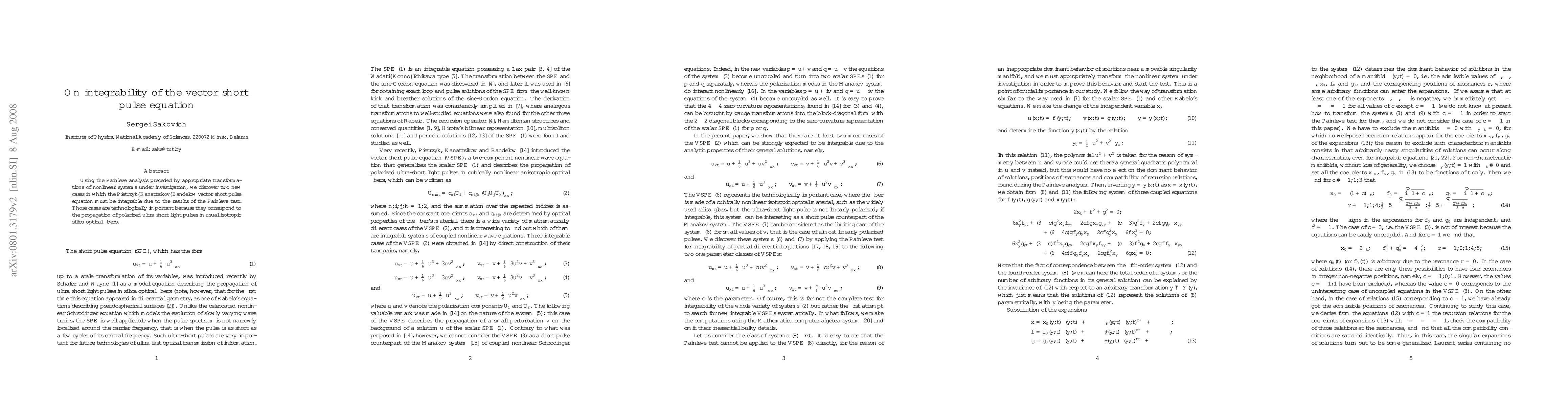 Using the Painleve analysis preceded by appropriate transformations of nonlinear systems under investigation, we discover two new cases in which the Pietrzyk-Kanattsikov-Bandelow vector short pulse equation must be integrable due to the results of the Painleve test. Those cases are technologically important because they correspond to the propagation of polarized ultra-short light pulses in usual isotropic silica optical fibers.