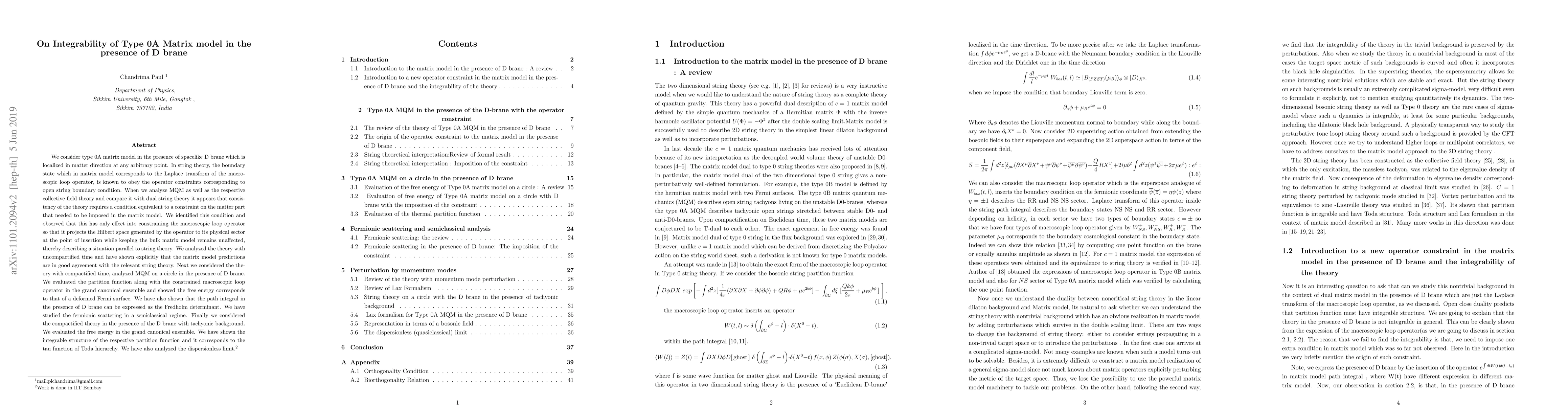 Researchers found that adding a D-brane to a type 0A matrix model leads to an integrable structure for the grand canonical partition function, mirroring string theory predictions.