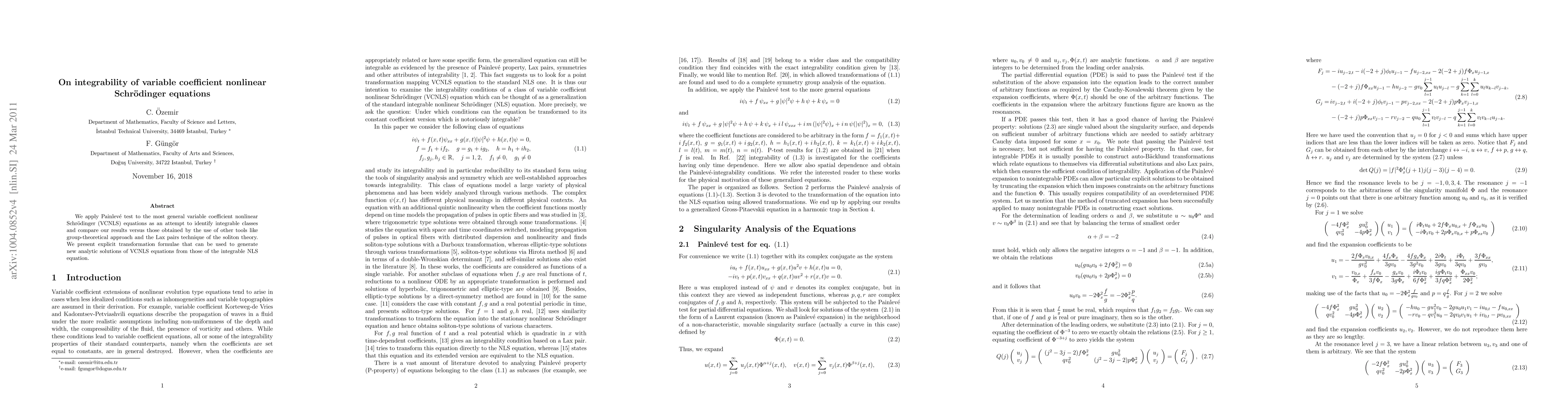 This paper uses the Painlevé test to explore the integrability of general variable coefficient nonlinear Schrödinger equations (VCNLS), identifying integrable classes and comparing results with group-theoretical and Lax pair methods. It also provides transformation formulae for generating new analytic solutions from integrable NLS equations.