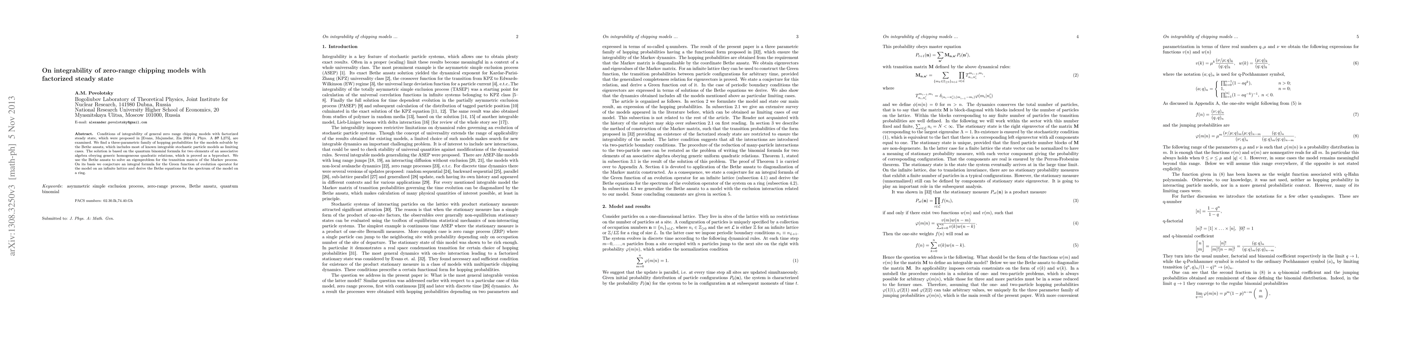 This paper examines the integrability conditions of zero-range chipping models with factorized steady state, identifying a three-parametric family of solvable models via the Bethe ansatz. The solution employs the quantum binomial formula and conjectures an integral formula for the Green function of the evolution operator.