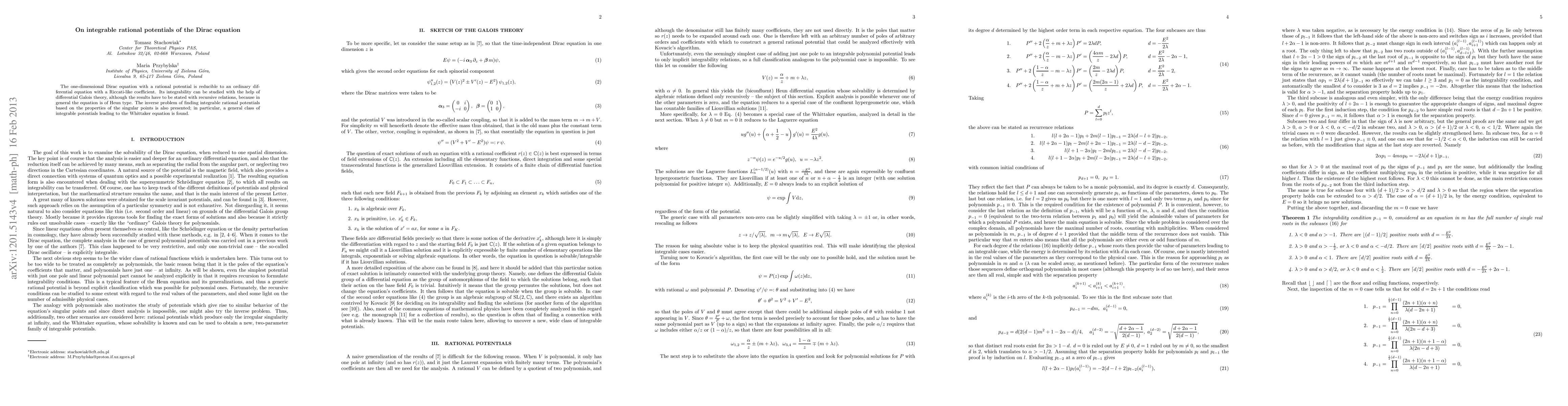 This paper explores the integrability of one-dimensional Dirac equations with rational potentials, reducing them to Riccati-like differential equations. It utilizes differential Galois theory to study these integrable systems, particularly focusing on the inverse problem to identify a general class of potentials leading to the Whittaker equation.