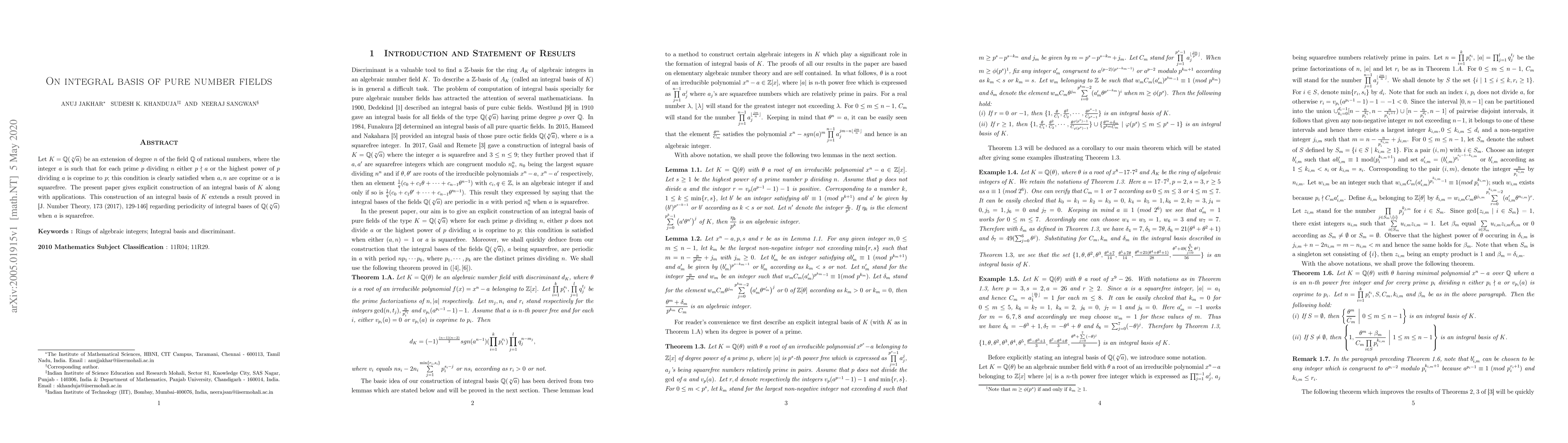 This paper constructs an explicit integral basis for pure number fields $K=\mathbb{Q}(\sqrt[n]{a})$, extending previous results on the periodicity of integral bases for squarefree $a$. Applications of this integral basis construction are also discussed.