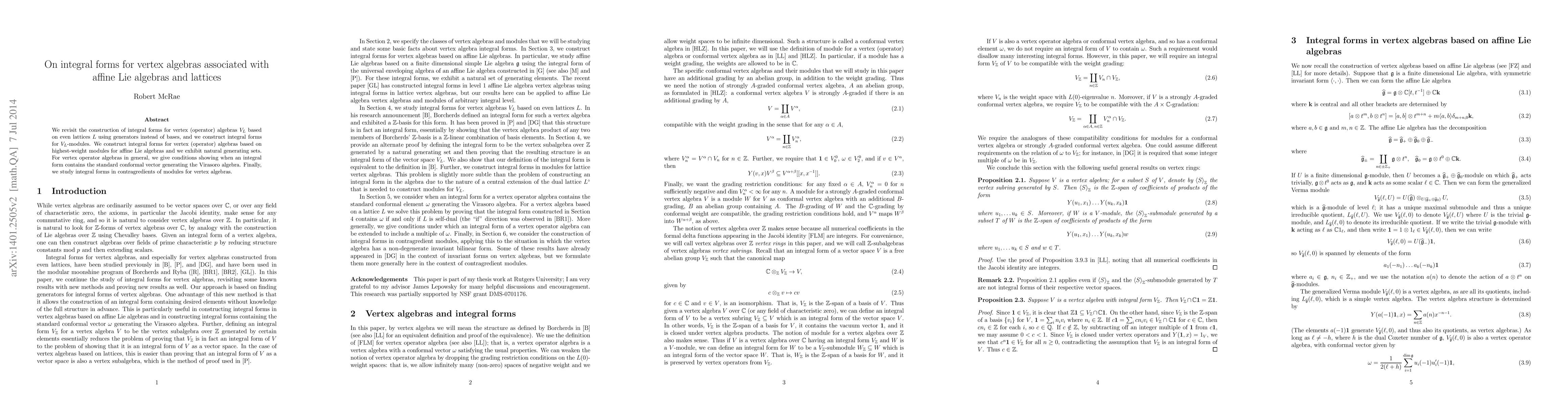 Summary: The paper constructs integral forms for vertex algebras associated with affine Lie algebras and lattices using generator-based methods and identifies conditions for the presence of the standard conformal vector. It also explores integral forms in contragredients of modules for vertex algebras.