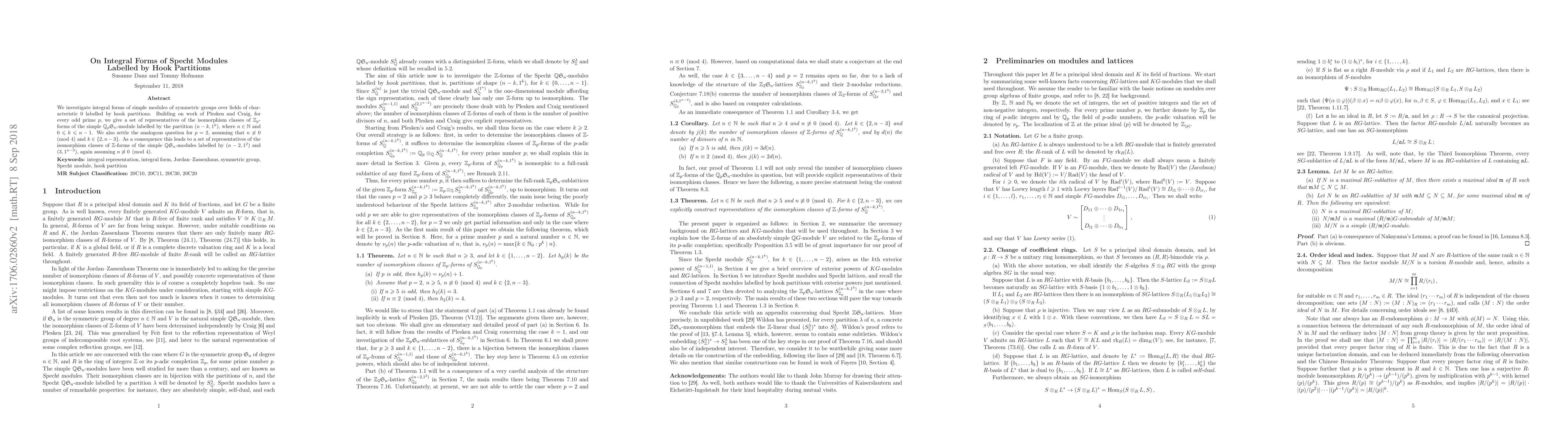 Researchers investigated integral forms of simple modules of symmetric groups over fields of characteristic 0 labelled by hook partitions, providing representatives for various isomorphism classes of p-forms.