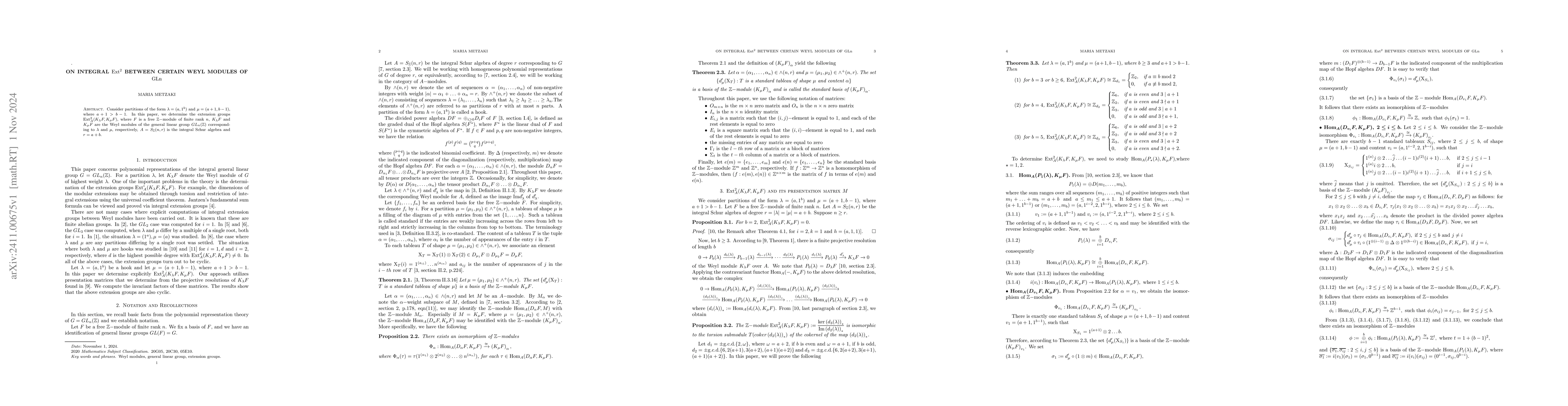 The research employs algebraic methods, specifically focusing on integral Ext^2 between certain Weyl modules of GLn, using operations D1 through D11 to simplify the matrix M and determine its invariant factors.