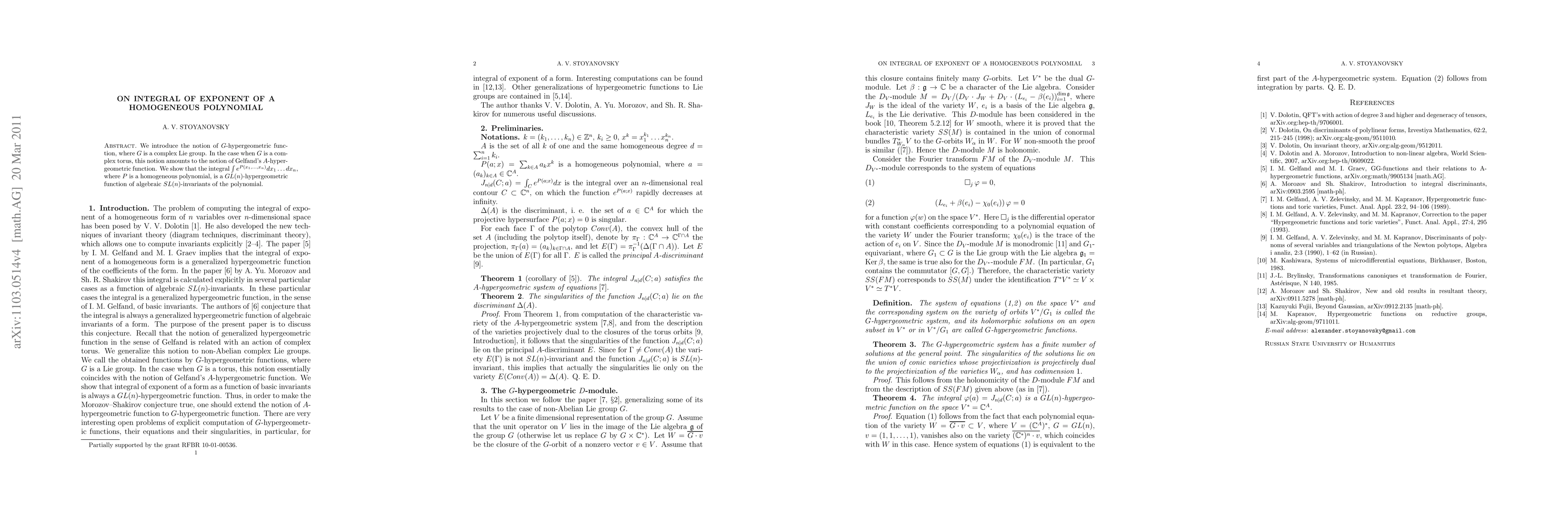 We introduce the notion of G-hypergeometric function, where G is a complex Lie group. In the case when G is a complex torus, this notion amounts to the notion of Gelfand's A-hypergeometric function. We show that the integral $\int e^{P(x_1,...,x_n)}dx_1...dx_n$, where P is a homogeneous polynomial, is a GL(n)-hypergeometric function of algebraic SL(n)-invariants of the polynomial.