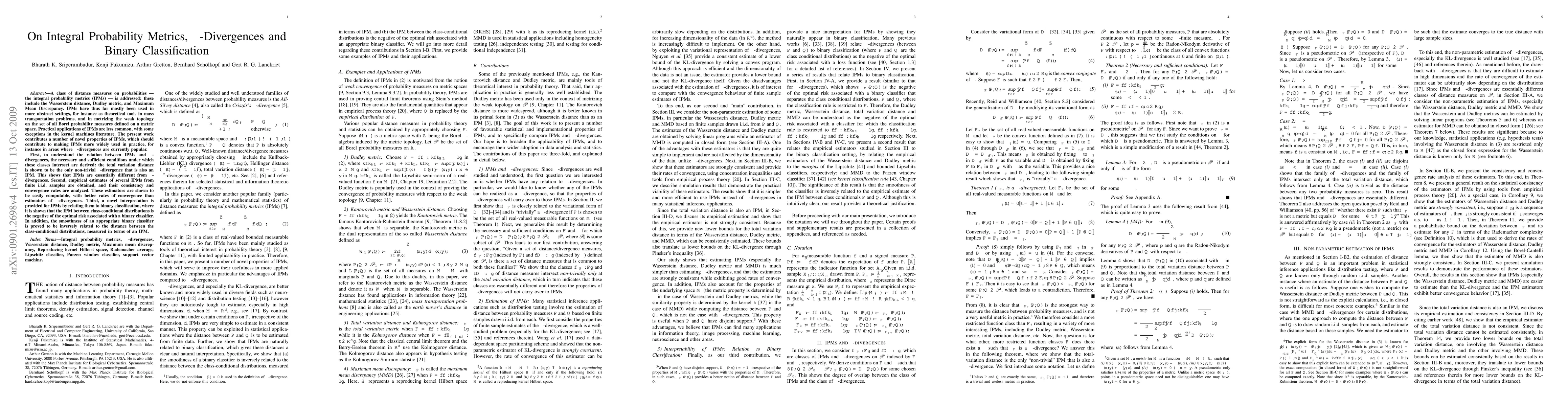 A class of distance measures on probabilities -- the integral probability metrics (IPMs) -- is addressed: these include the Wasserstein distance, Dudley metric, and Maximum Mean Discrepancy. IPMs have thus far mostly been used in more abstract settings, for instance as theoretical tools in mass transportation problems, and in metrizing the weak topology on the set of all Borel probability measures defined on a metric space. Practical applications of IPMs are less common, with some exceptions in the kernel machines literature. The present work contributes a number of novel properties of IPMs, which should contribute to making IPMs more widely used in practice, for instance in areas where $\phi$-divergences are currently popular. First, to understand the relation between IPMs and $\phi$-divergences, the necessary and sufficient conditions under which these classes intersect are derived: the total variation distance is shown to be the only non-trivial $\phi$-divergence that is also an IPM. This shows that IPMs are essentially different from $\phi$-divergences. Second, empirical estimates of several IPMs from finite i.i.d. samples are obtained, and their consistency and convergence rates are analyzed. These estimators are shown to be easily computable, with better rates of convergence than estimators of $\phi$-divergences. Third, a novel interpretation is provided for IPMs by relating them to binary classification, where it is shown that the IPM between class-conditional distributions is the negative of the optimal risk associated with a binary classifier. In addition, the smoothness of an appropriate binary classifier is proved to be inversely related to the distance between the class-conditional distributions, measured in terms of an IPM.
