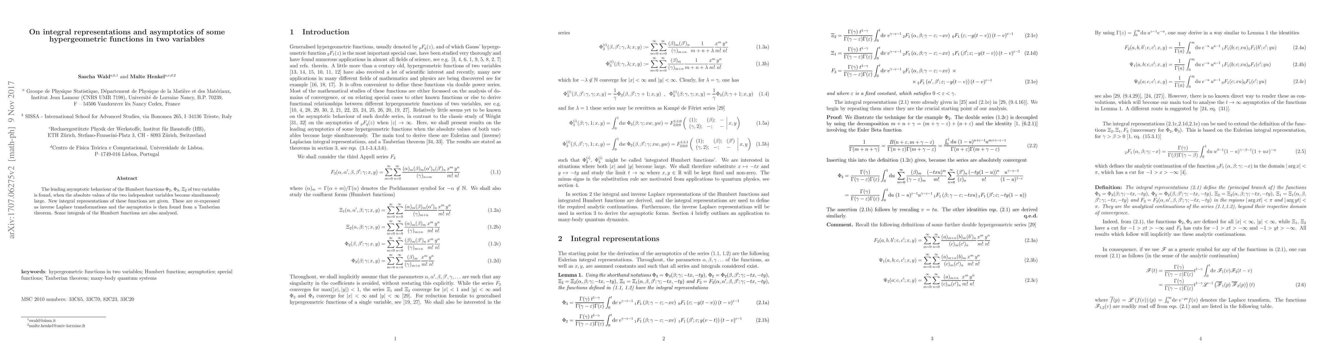 The leading asymptotic behaviour of the Humbert functions $\Phi_2$, $\Phi_3$, $\Xi_2$ of two variables is found, when the absolute values of the two independent variables become simultaneosly large. New integral representations of these functions are given. These are re-expressed as inverse Laplace transformations and the asymptotics is then found from a Tauberian theorem. Some integrals of the Humbert functions are also analysed.