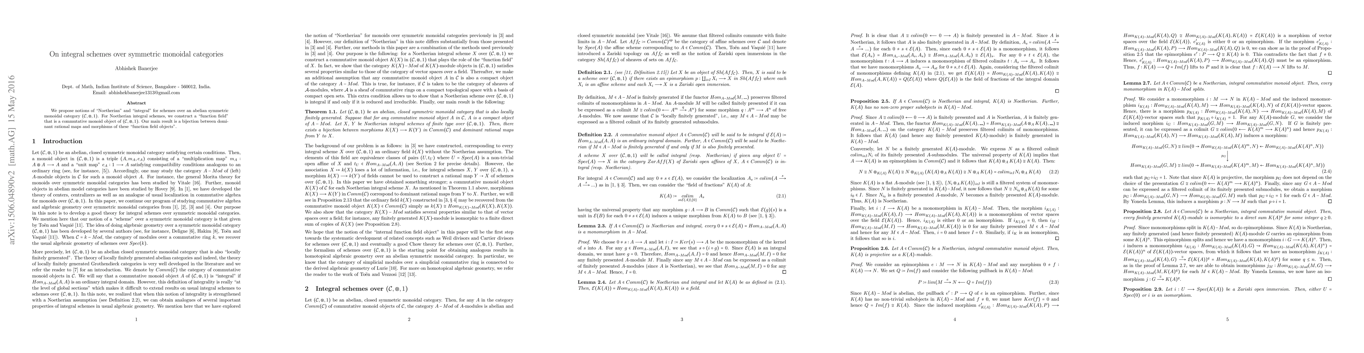 This paper introduces concepts of "Noetherian" and "integral" schemes over abelian symmetric monoidal categories, constructs a "function field" for Noetherian integral schemes, and demonstrates that under specific conditions, a Noetherian scheme is integral if and only if it is reduced and irreducible.