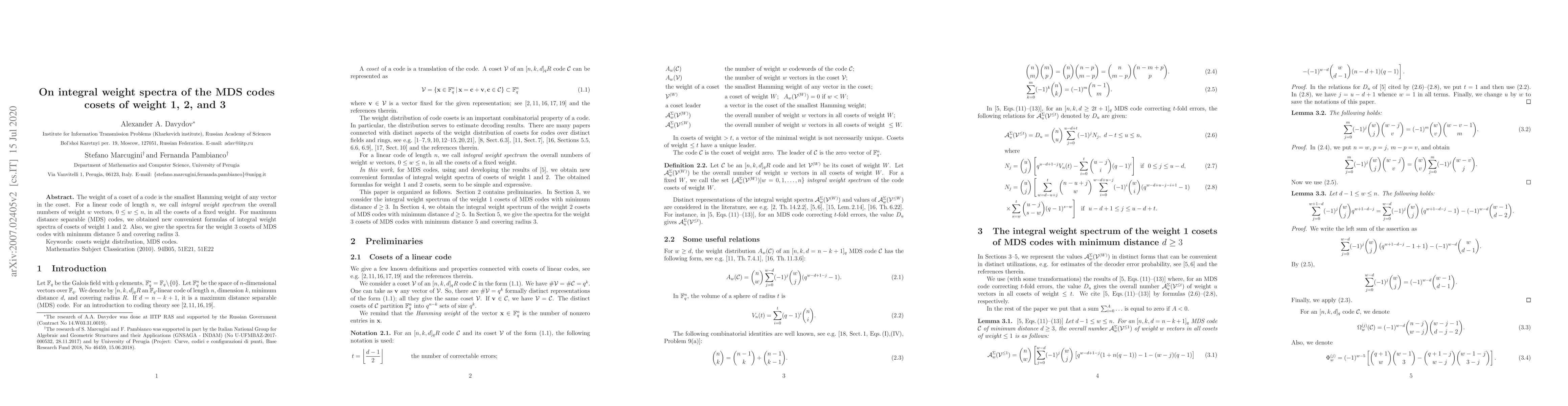This paper presents new formulas for integral weight spectra of cosets in MDS codes with specific minimum distance and covering radius, providing a more precise understanding of code properties.