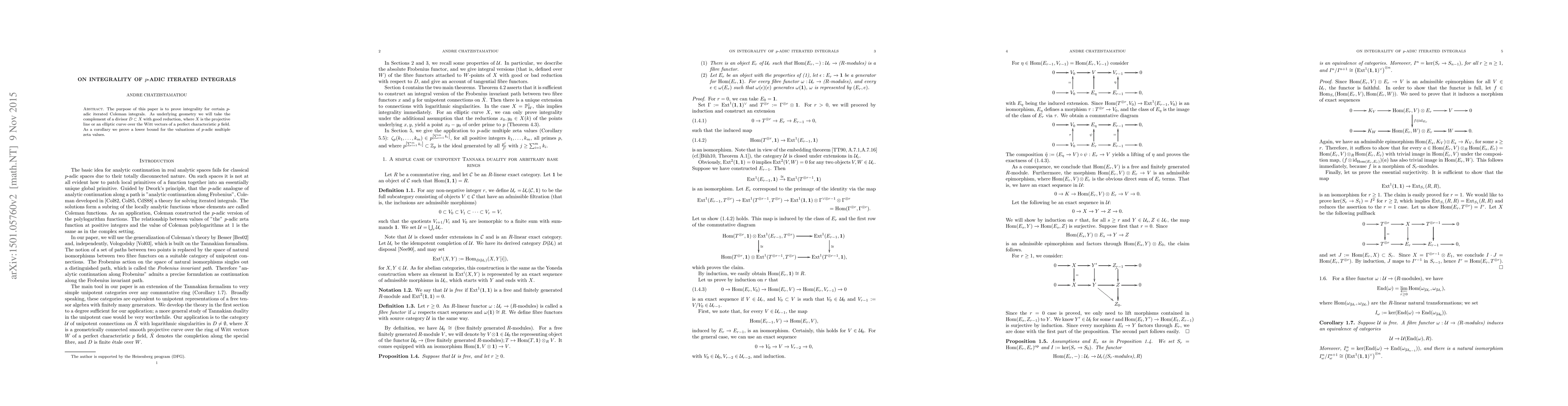 The purpose of this paper is to prove integrality for certain $p$-adic iterated Coleman integrals. As underlying geometry we will take the complement of a divisor $D\subset X$ with good reduction, where $X$ is the projective line or an elliptic curve over the Witt vectors of a perfect characteristic $p$ field. As a corollary we prove a lower bound for the valuations of $p$-adic multiple zeta values.