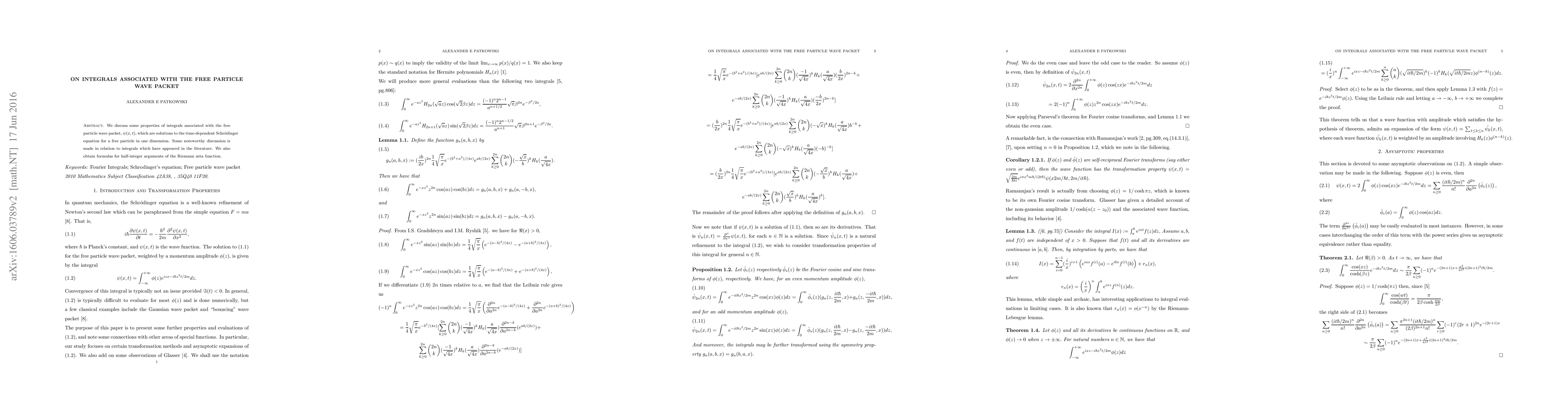 We discuss some properties of integrals associated with the free particle wave packet, $\psi(x,t),$ which are solutions to the time-dependent Schr$\ddot{o}$dinger equation for a free particle in one dimension. Some noteworthy discussion is made in relation to integrals which have appeared in the literature. We also obtain formulas for half-integer arguments of the Riemann zeta function.