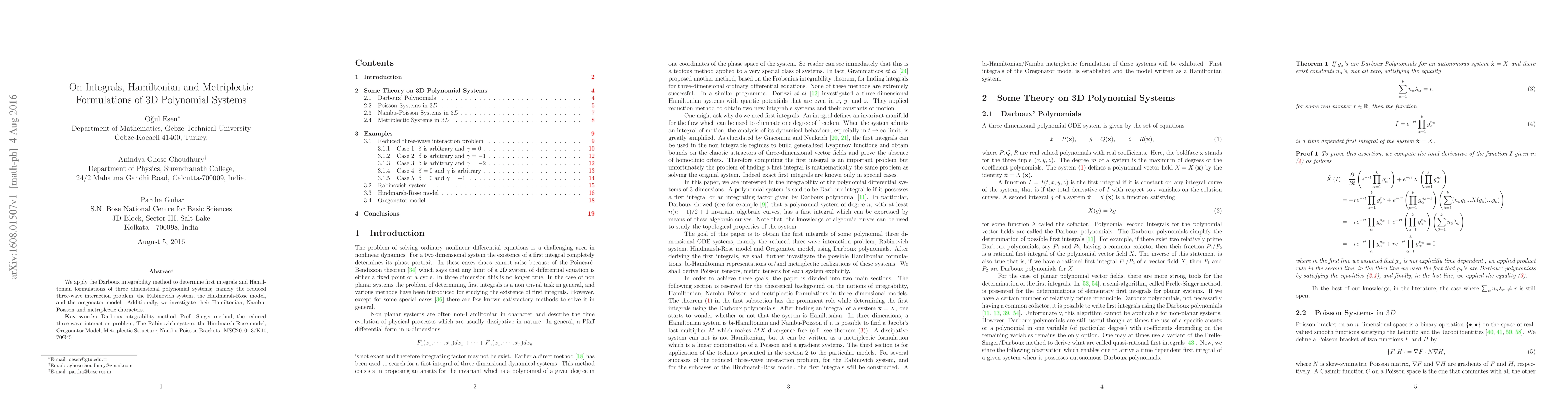 This paper applies the Darboux integrability method to derive first integrals and Hamiltonian formulations for several 3D polynomial systems, including the reduced three-wave interaction problem, the Rabinovich system, the Hindmarsh-Rose model, and the Oregonator model. It also explores their Hamiltonian, Nambu-Poisson, and metriplectic characteristics.