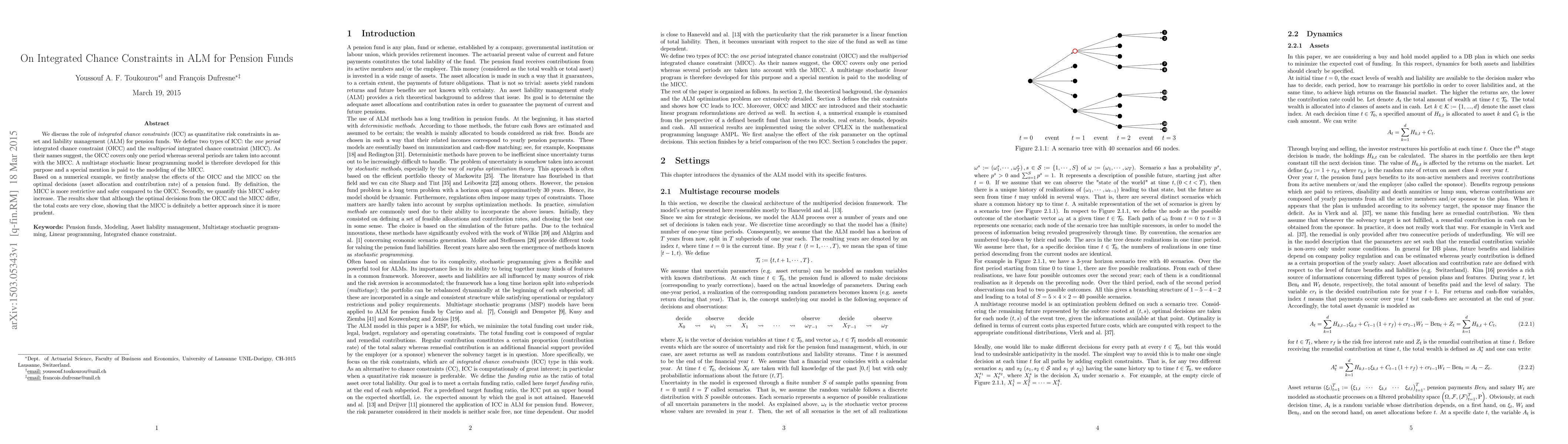 This paper explores integrated chance constraints (ICC) as risk management tools in pension fund asset and liability management (ALM), distinguishing between one-period and multiperiod ICCs. It develops a multistage stochastic linear programming model to evaluate the impact of these constraints on optimal decisions, demonstrating that while the multiperiod ICC is more restrictive, it offers greater safety with minimal increase in cost.