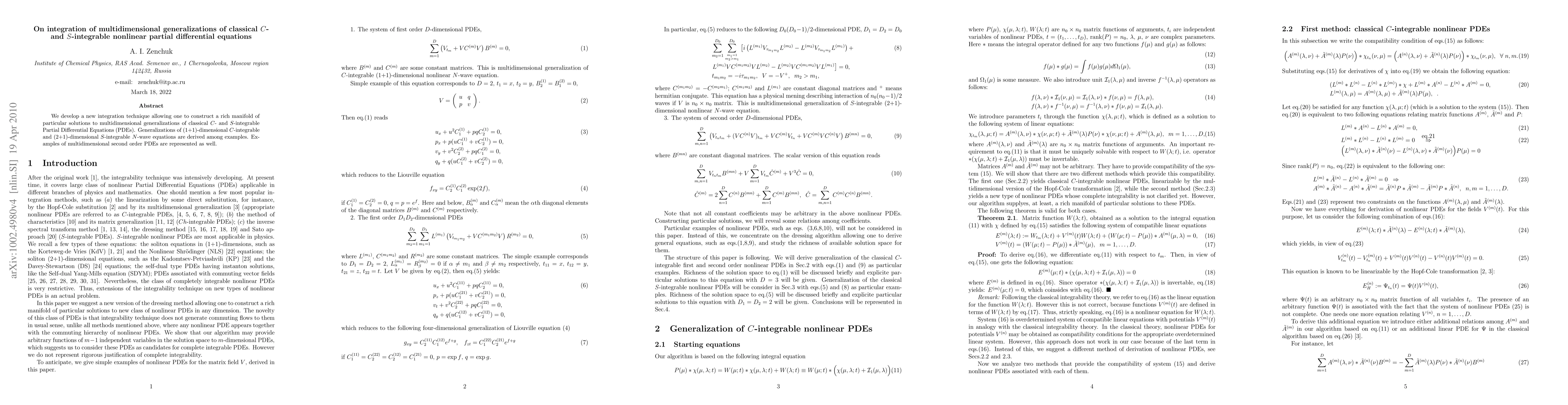 We develop a new integration technique allowing one to construct a rich manifold of particular solutions to multidimensional generalizations of classical $C$- and $S$-integrable Partial Differential Equations (PDEs). Generalizations of (1+1)-dimensional $C$-integrable and (2+1)-dimensional $S$-integrable $N$-wave equations are derived among examples. Examples of multidimensional second order PDEs are represented as well.