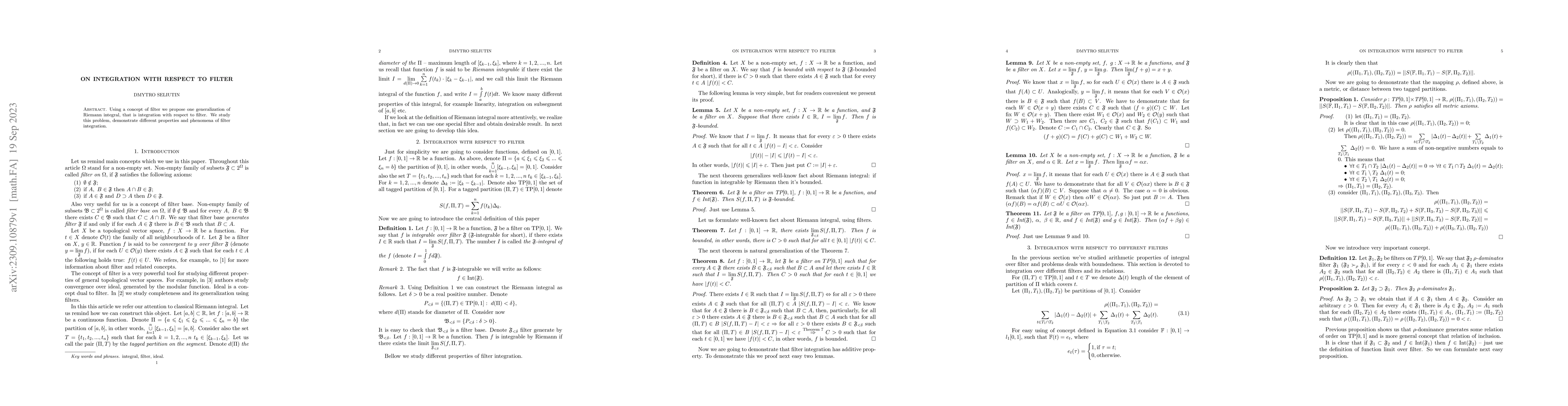 This paper introduces a generalization of the Riemann integral called integration with respect to filter, explores its properties, and demonstrates various phenomena associated with this new concept. The study aims to extend the classical integration framework using the concept of filters.