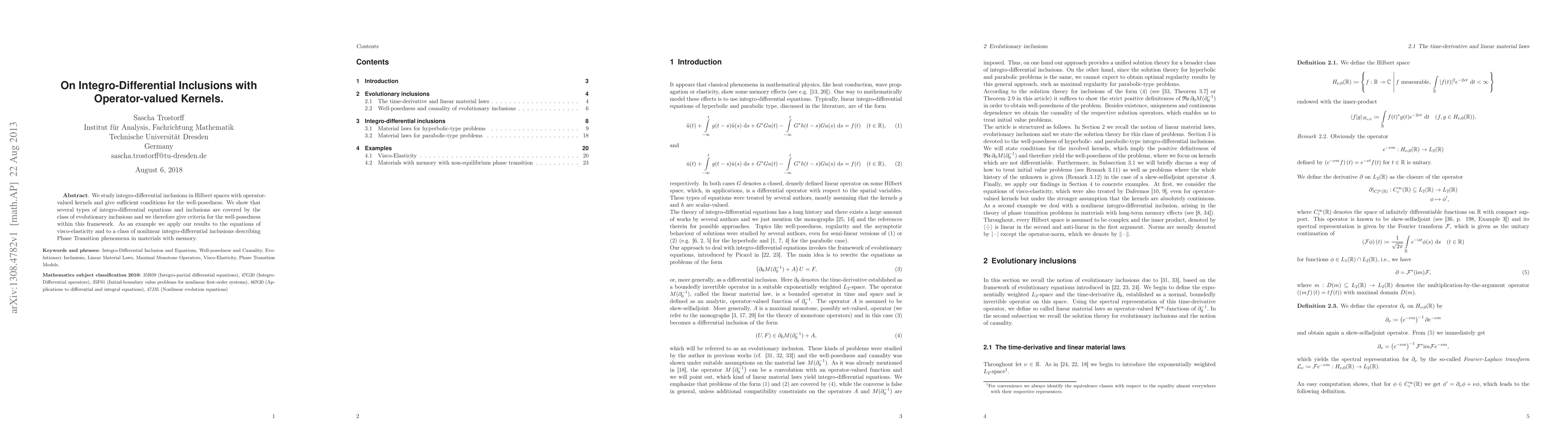 We study integro-differential inclusions in Hilbert spaces with operator-valued kernels and give sufficient conditions for the well-posedness. We show that several types of integro-differential equations and inclusions are covered by the class of evolutionary inclusions and we therefore give criteria for the well-posedness within this framework. As an example we apply our results to the equations of visco-elasticity and to a class of nonlinear integro-differential inclusions describing Phase Transition phenomena in materials with memory.