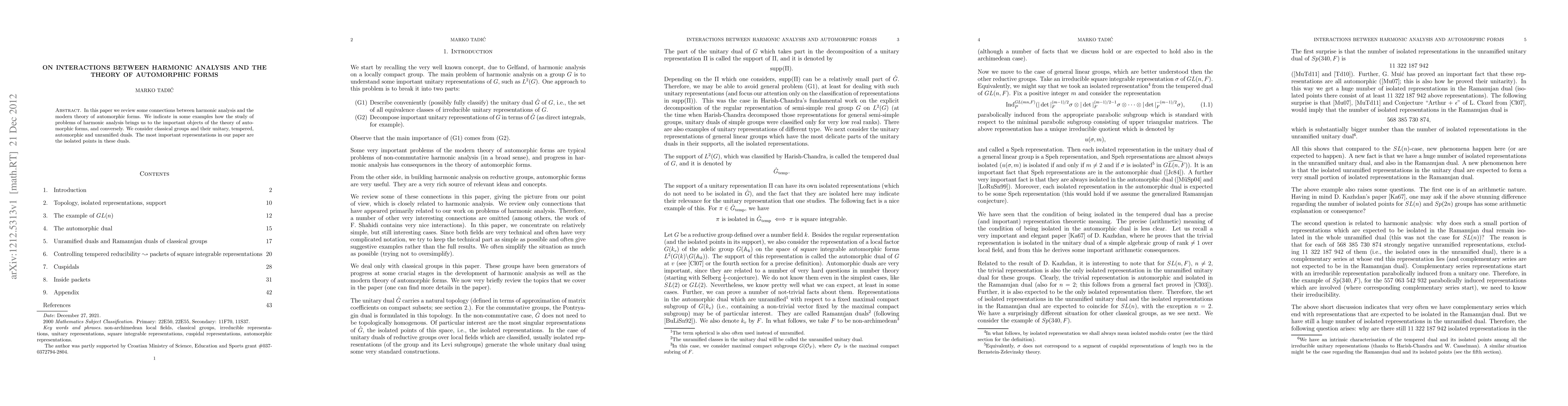 This paper reviews the interplay between harmonic analysis and automorphic forms, demonstrating how harmonic analysis leads to significant objects in automorphic theory and vice versa, focusing on classical groups and their various duals, particularly isolated points in these duals.