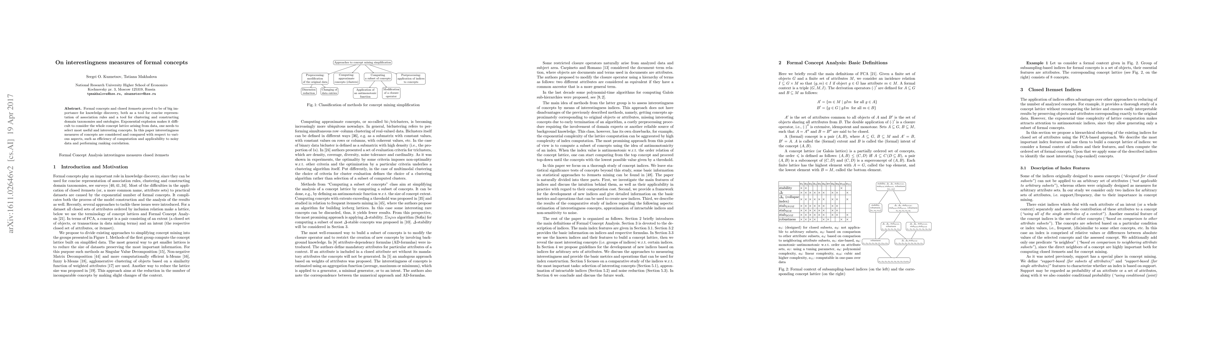 This paper explores and compares various interestingness measures for formal concepts and closed itemsets, focusing on their computational efficiency and effectiveness in handling noisy data and ranking correlations for knowledge discovery.