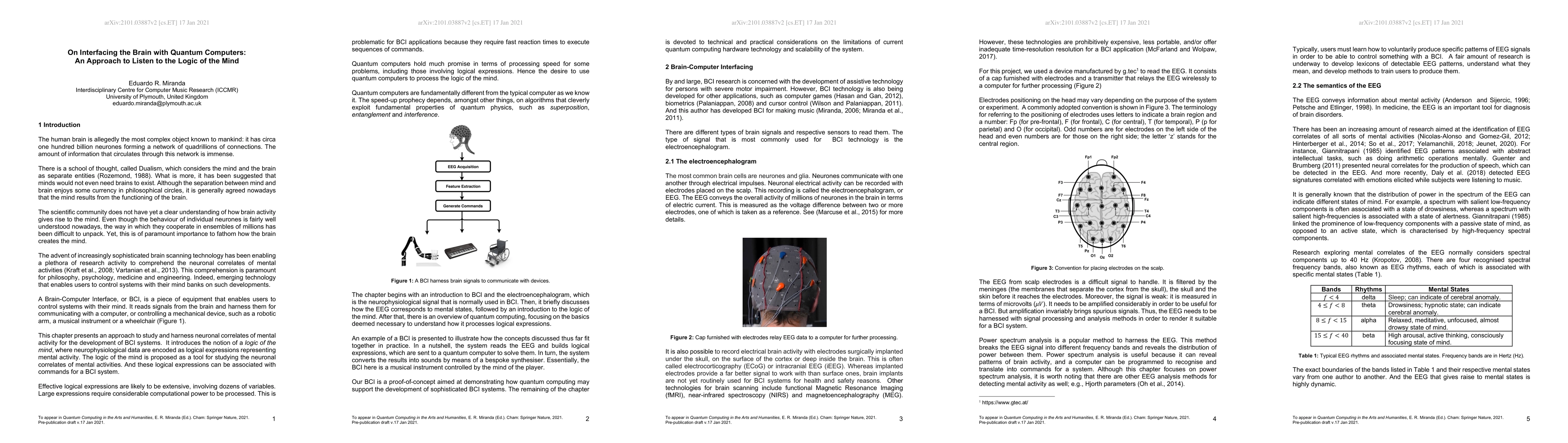 This chapter presents a quantum computing-based approach to study and harness neuronal correlates of mental activity for the development of Brain-Computer Interface (BCI) systems. It introduces the notion of a logic of the mind, where neurophysiological data are encoded as logical expressions representing mental activity. Effective logical expressions are likely to be extensive, involving dozens of variables. Large expressions require considerable computational power to be processed. This is problematic for BCI applications because they require fast reaction times to execute sequences of commands. Quantum computers hold much promise in terms of processing speed for some problems, including those involving logical expressions. Hence, we propose to use quantum computers to process the logic of the mind. The chapter begins with an introduction to BCI and the electroencephalogram, which is the neurophysiological signal that is normally used in BCI. Then, it briefly discusses how the EEG corresponds to mental states, followed by an introduction to the logic of the mind. After that, there is an overview of quantum computing, focusing on the basics deemed necessary to understand how it processes logical expressions. An example of a BCI system is presented. In a nutshell, the system reads the EEG and builds logical expressions, which are sent to a quantum computer to solve them. In turn, the system converts the results into sounds by means of a bespoke synthesiser. Essentially, the BCI here is a musical instrument controlled by the mind of the player. Our BCI is a proof-of-concept aimed at demonstrating how quantum computing may support the development of sophisticated BCI systems. The remaining of the chapter is devoted to technical and practical considerations on the limitations of current quantum computing hardware technology and scalability of the system.