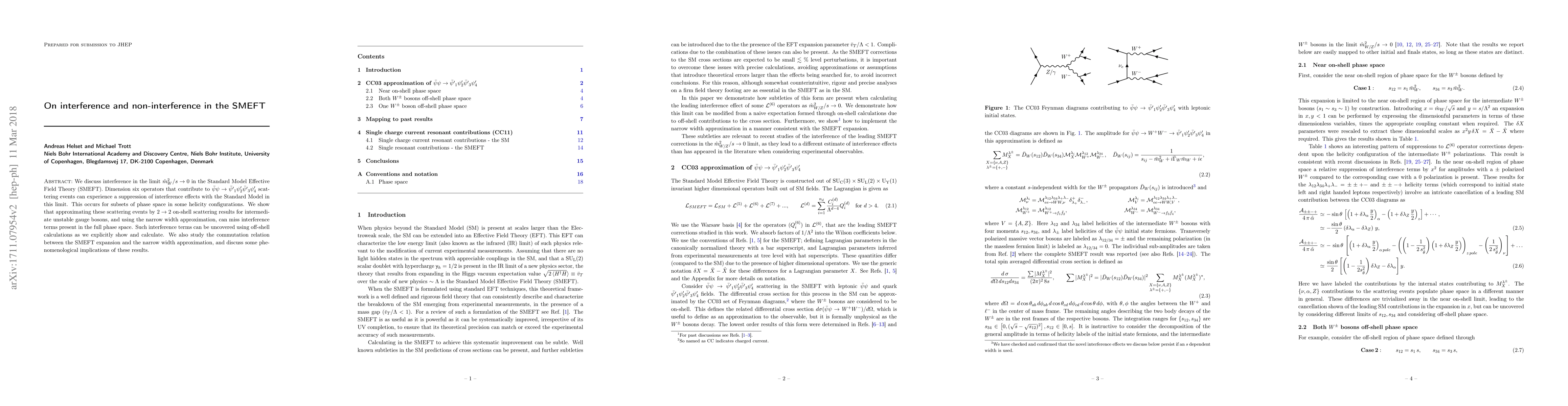 We discuss interference in the limit $\hat{m}_{W}^2/s \rightarrow 0$ in the Standard Model Effective Field Theory (SMEFT). Dimension six operators that contribute to $\bar{\psi} \psi \rightarrow \bar{\psi'}_1 \psi_2' \bar{\psi'}_3 \psi'_4$ scattering events can experience a suppression of interference effects with the Standard Model in this limit. This occurs for subsets of phase space in some helicity configurations. We show that approximating these scattering events by $2\rightarrow 2$ on-shell scattering results for intermediate unstable gauge bosons, and using the narrow width approximation, can miss interference terms present in the full phase space. Such interference terms can be uncovered using off-shell calculations as we explicitly show and calculate. We also study the commutation relation between the SMEFT expansion and the narrow width approximation, and discuss some phenomenological implications of these results.