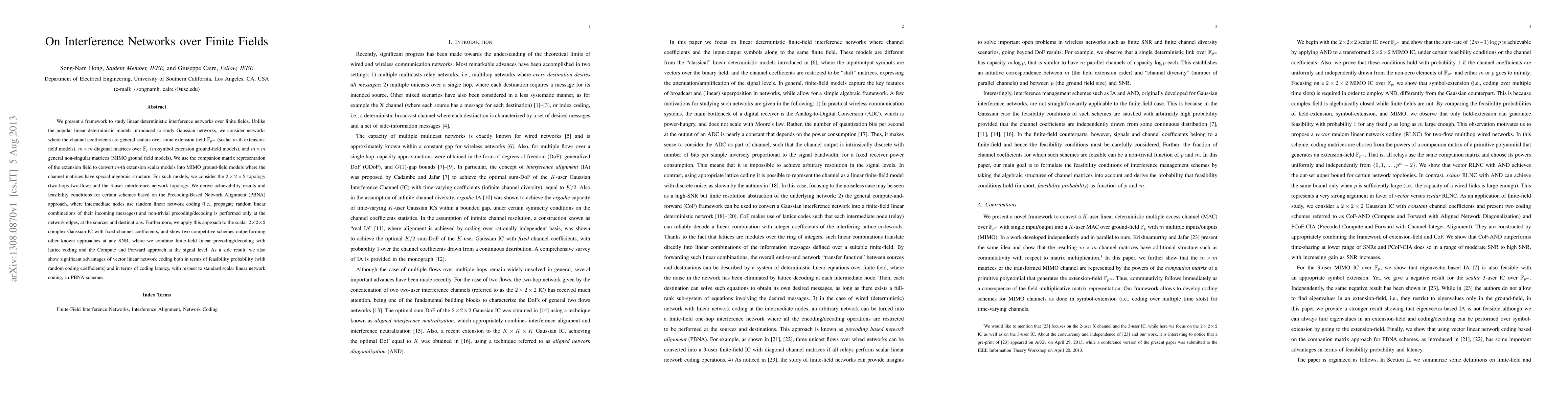 We present a framework to study linear deterministic interference networks over finite fields. Unlike the popular linear deterministic models introduced to study Gaussian networks, we consider networks where the channel coefficients are general scalars over some extension field $\FF_{p^m}$ (scalar $m$-th extension-field models), $m \times m$ diagonal matrices over $\FF_p$ ($m$-symbol extension ground-field models), and $m \times m$ general non-singular matrices (MIMO ground field models). We use the companion matrix representation of the extension field to convert $m$-th extension scalar models into MIMO ground-field models where the channel matrices have special algebraic structure. For such models, we consider the $2 \times 2 \times 2$ topology (two-hops two-flow) and the 3-user interference network topology. We derive achievability results and feasibility conditions for certain schemes based on the Precoding-Based Network Alignment (PBNA) approach, where intermediate nodes use random linear network coding (i.e., propagate random linear combinations of their incoming messages) and non-trivial precoding/decoding is performed only at the network edges, at the sources and destinations. Furthermore, we apply this approach to the scalar $2\times 2\times 2$ complex Gaussian IC with fixed channel coefficients, and show two competitive schemes outperforming other known approaches at any SNR, where we combine finite-field linear precoding/decoding with lattice coding and the Compute and Forward approach at the signal level. As a side result, we also show significant advantages of vector linear network coding both in terms of feasibility probability (with random coding coefficients) and in terms of coding latency, with respect to standard scalar linear network coding, in PBNA schemes.