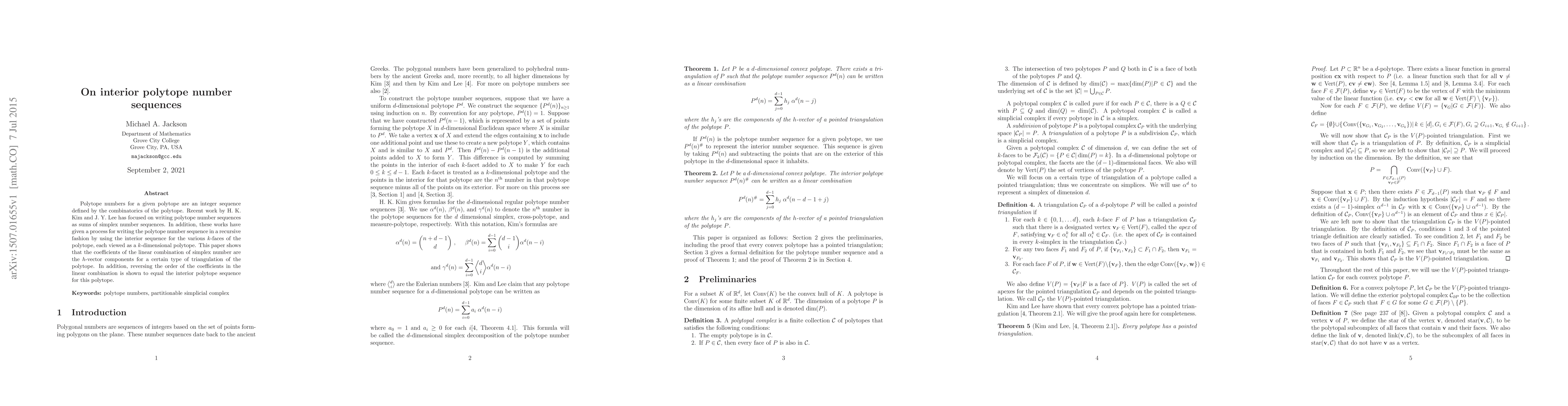 Polytope numbers for a given polytope are an integer sequence defined by the combinatorics of the polytope. Recent work by H. K. Kim and J. Y. Lee has focused on writing polytope number sequences as sums of simplex number sequences. In addition, these works have given a process for writing the polytope number sequence in a recursive fashion by using the interior sequence for the various k-faces of the polytope, each viewed as a k-dimensional polytope. This paper shows that the coefficients of the linear combination of simplex number are the h-vector components for a certain type of triangulation of the polytope. In addition, reversing the order of the coefficients in the linear combination is shown to equal the interior polytope sequence for this polytope.
