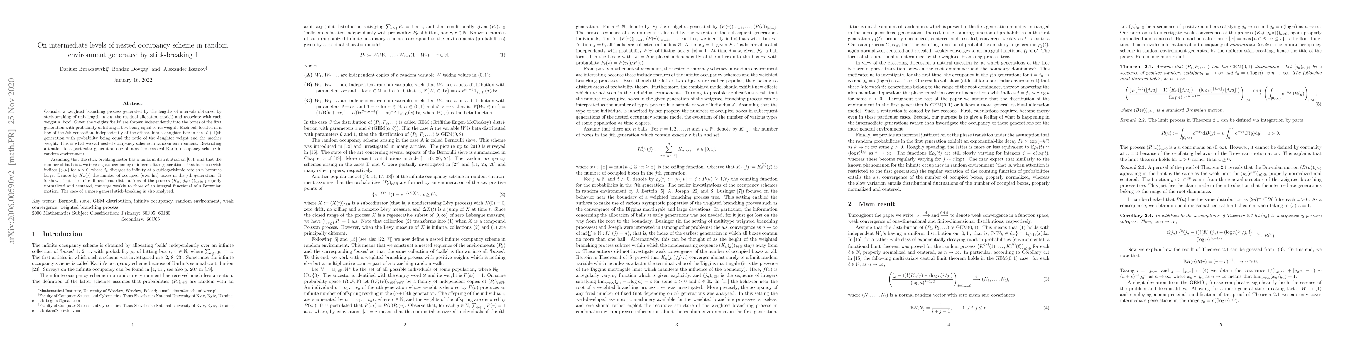 Consider a weighted branching process generated by the lengths of intervals obtained by stick-breaking of unit length (a.k.a. the residual allocation model) and associate with each weight a `box'. Given the weights `balls' are thrown independently into the boxes of the first generation with probability of hitting a box being equal to its weight. Each ball located in a box of the $j$th generation, independently of the others, hits a daughter box in the $(j+1)$th generation with probability being equal the ratio of the daughter weight and the mother weight. This is what we call nested occupancy scheme in random environment. Restricting attention to a particular generation one obtains the classical Karlin occupancy scheme in random environment. Assuming that the stick-breaking factor has a uniform distribution on $[0,1]$ and that the number of balls is $n$ we investigate occupancy of intermediate generations, that is, those with indices $\lfloor j_n u\rfloor$ for $u>0$, where $j_n$ diverges to infinity at a sublogarithmic rate as $n$ becomes large. Denote by $K_n(j)$ the number of occupied (ever hit) boxes in the $j$th generation. It is shown that the finite-dimensional distributions of the process $(K_n(\lfloor j_n u\rfloor))_{u>0}$, properly normalized and centered, converge weakly to those of an integral functional of a Brownian motion. The case of a more general stick-breaking is also analyzed.